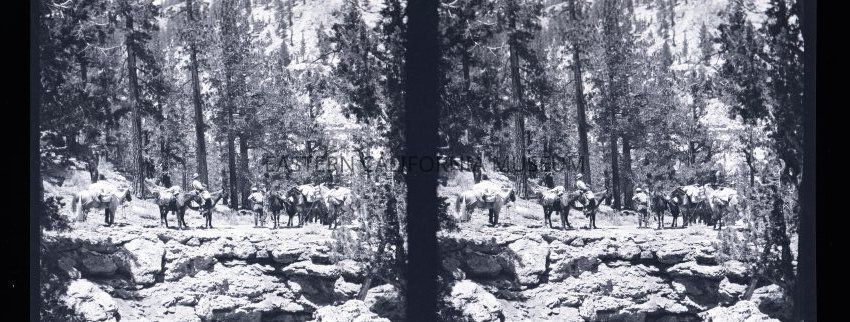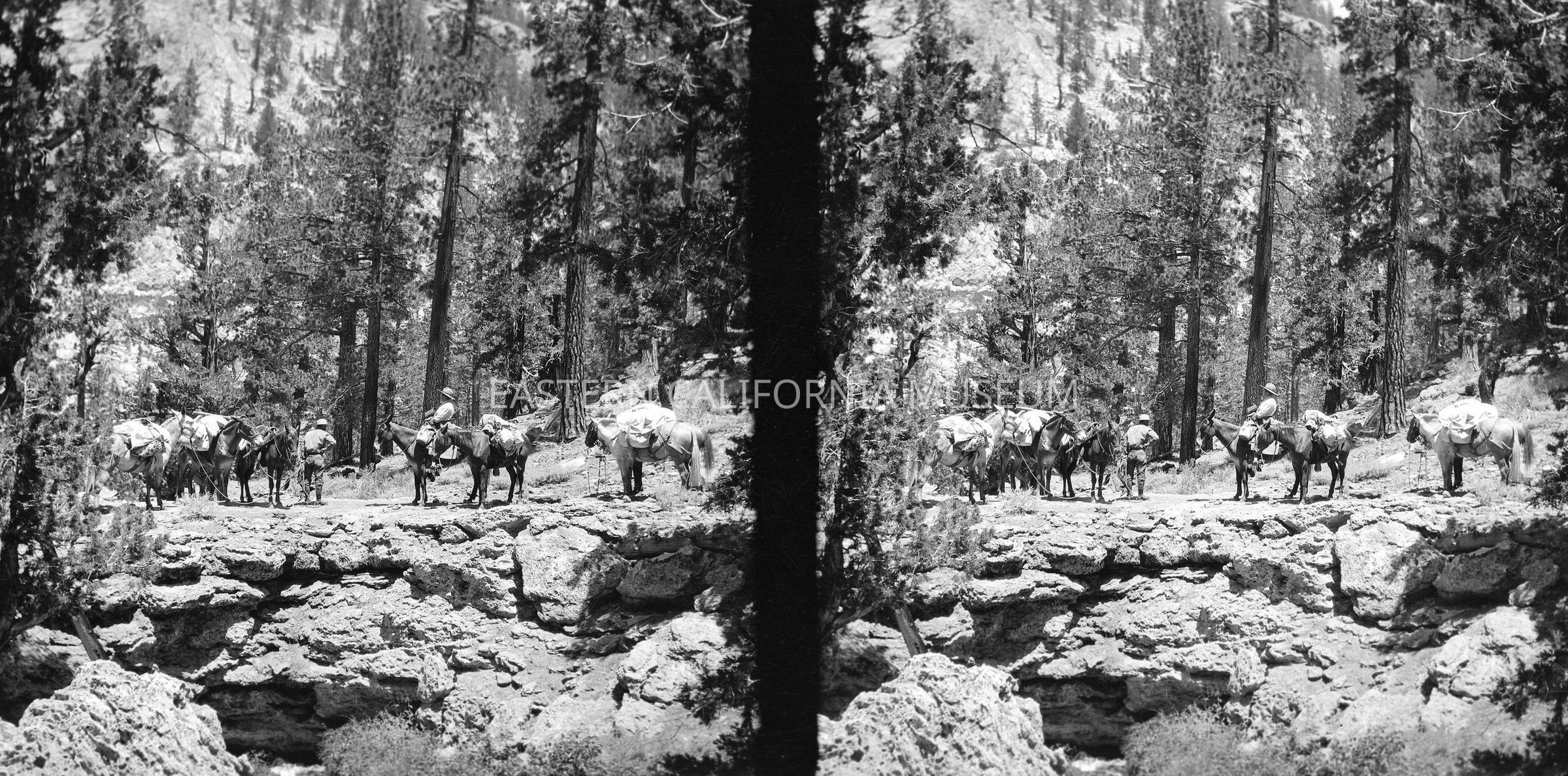 Negative of a stereoscopic image of two people with a packtrain in a forest. Maybe same location as 2014.14.2?