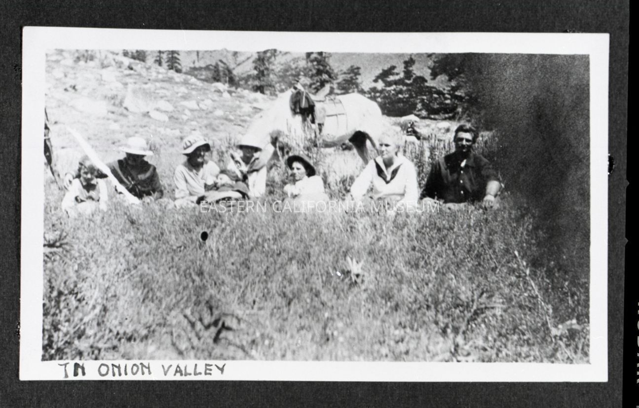 Photo taken of a photo in an album. It is of a group of eight people sitting on a mountainside with a saddled horse in the background. Someone has written along the bottom edge of the photo, "In Onion Valley."