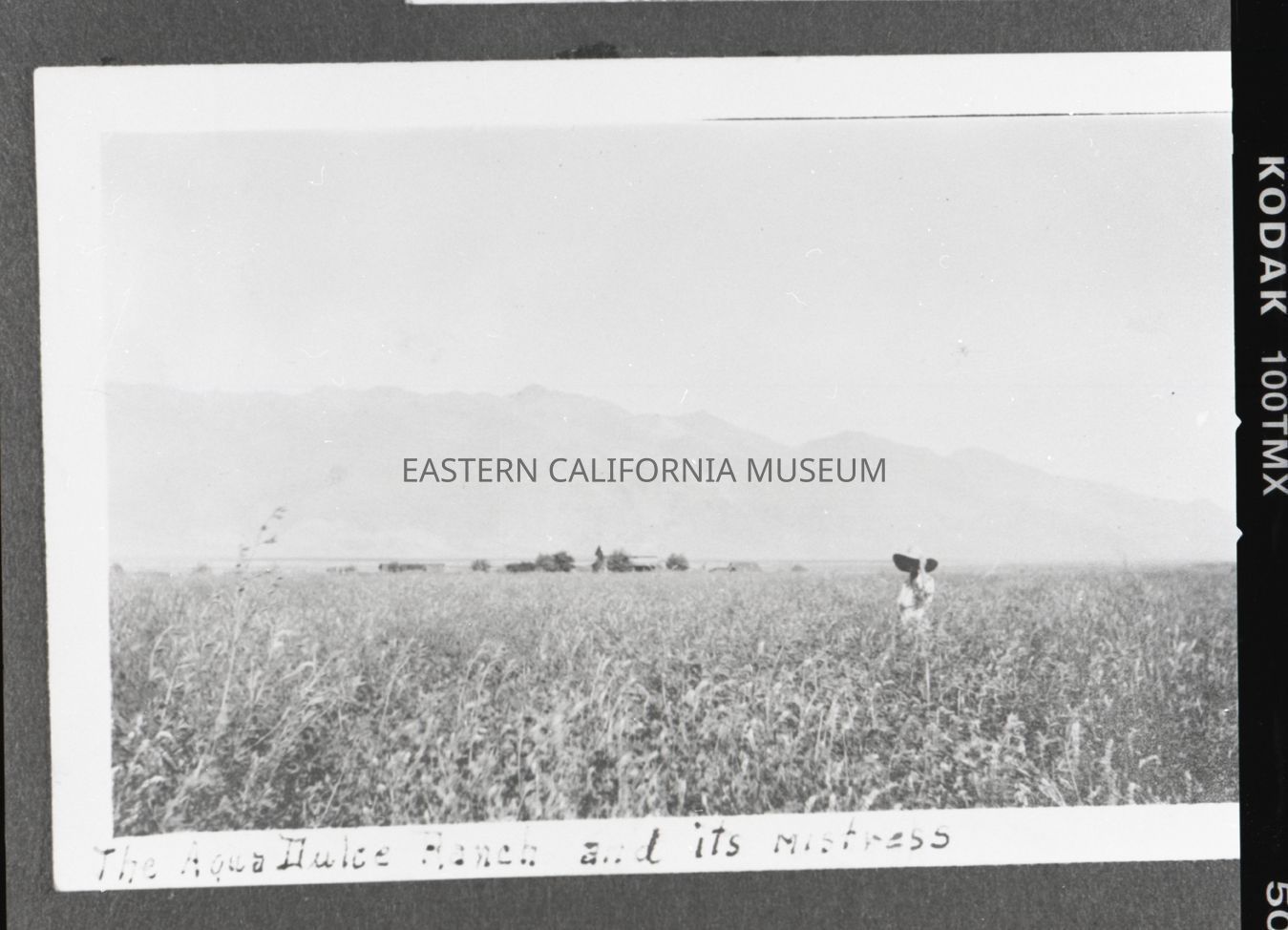 Photo taken of a photo in an album. It is of a woman wearing a large floppy hat standing in a field of waist-high wheat or something similar. There is a house or barn in the distance, and in the background is the Inyo mountain range. Someone has written along the bottom edge of the photo, "The Agua Dulce Ranch and its Mistress." Location may be Manzanar.