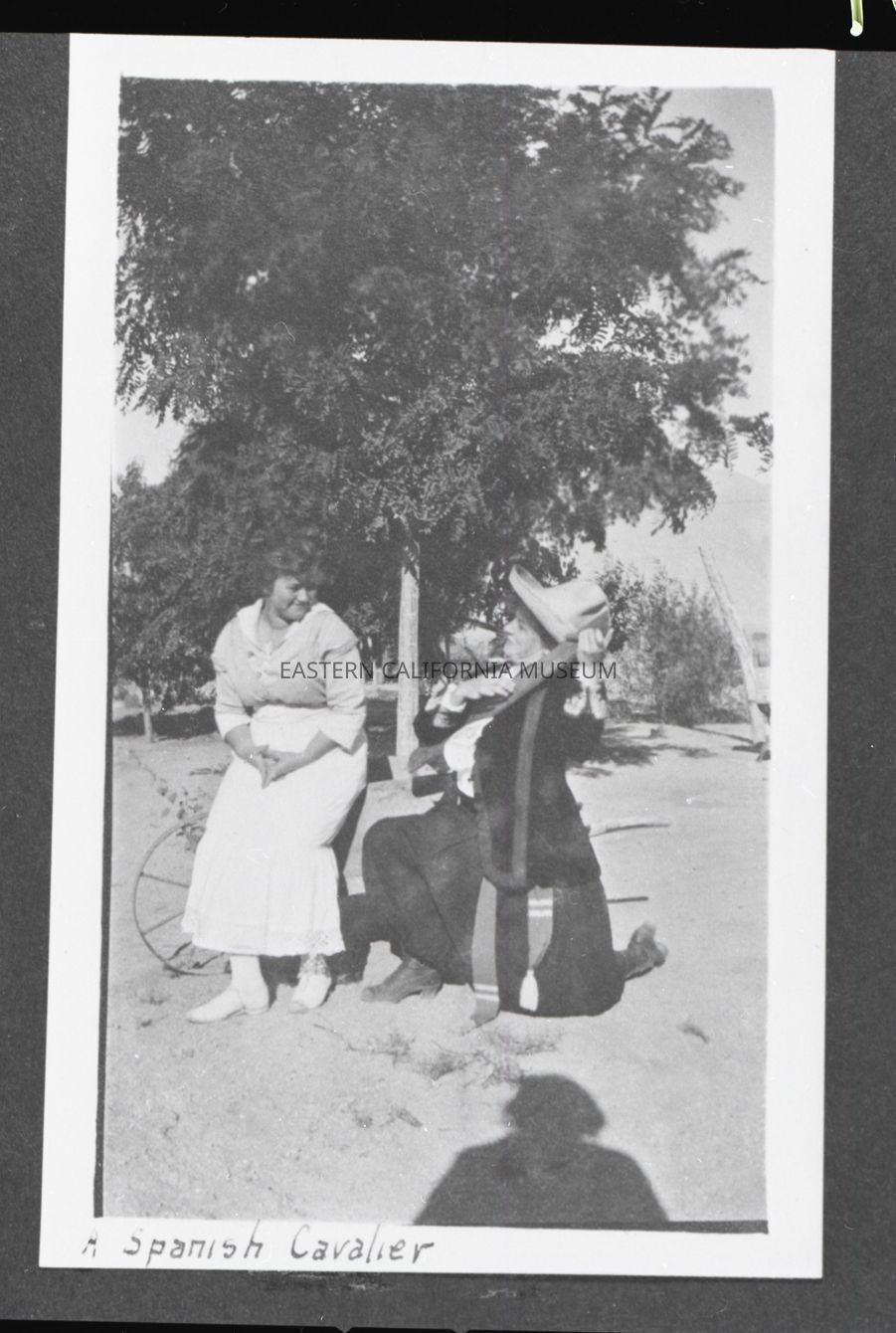 Photo taken of a photo in an album. It is of a woman dressed in costume as a man kneeling down and serenading another woman with an instrument (or maybe just a piece of wood or tool?). The woman is sitting on a wheelbarrow, and they appear to be in an orchard. Someone has written along the bottom edge of the photo, "A Spanish Cavilier [cavalier]." Location may be Manzanar.