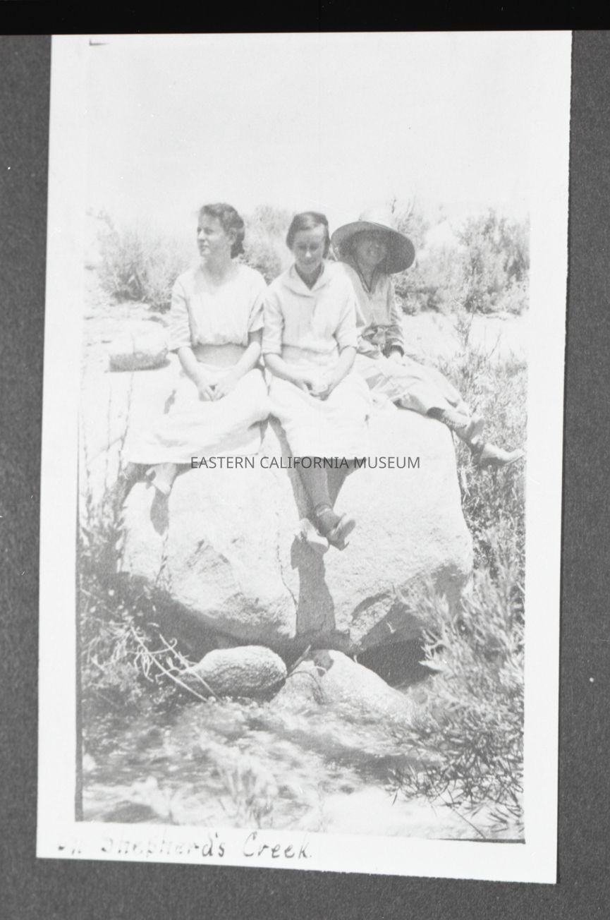 Photo taken of a photo in an album. It is of three women sitting on a boulder with a rushing creek at their feet. Someone has written along the bottom edge of the photo, "On Shepherd's Creek."