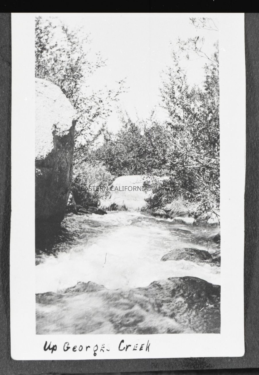 Photo taken of a photo in an album. It looks like someone is standing in the middle of a rushing creek taking the picture (maybe standing on a rock?). Someone has written along the bottom edge of the photo, "Up Georges Creek."