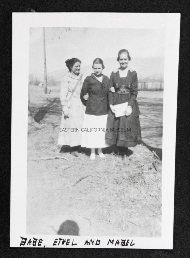 Photo taken of a photo in an album. It is of three young women standing outside. The girl on the right is holding something rectangular and white in her hands (could it be a book or diploma?). Someone has written along the bottom edge of the photo, "Babe, Ethel and Mabel." Location may be Independence.