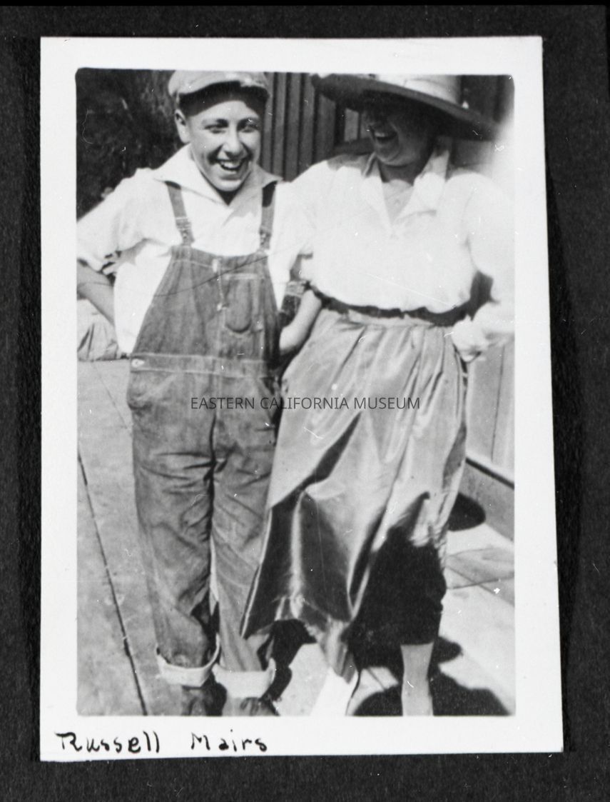 Photo taken of a photo in an album. It is of a man and woman laughing together. They are standing on a wooden platform or porch. Someone has written along the bottom edge of the photo, "Russell Mairs."