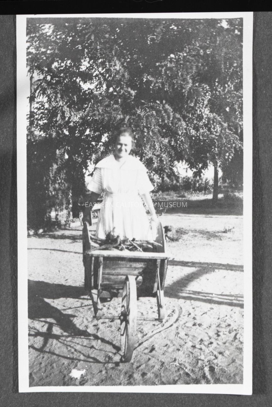 Photo taken of a photo in an album. It is of a young woman pushing a wheelbarrow filled with twigs and sticks.