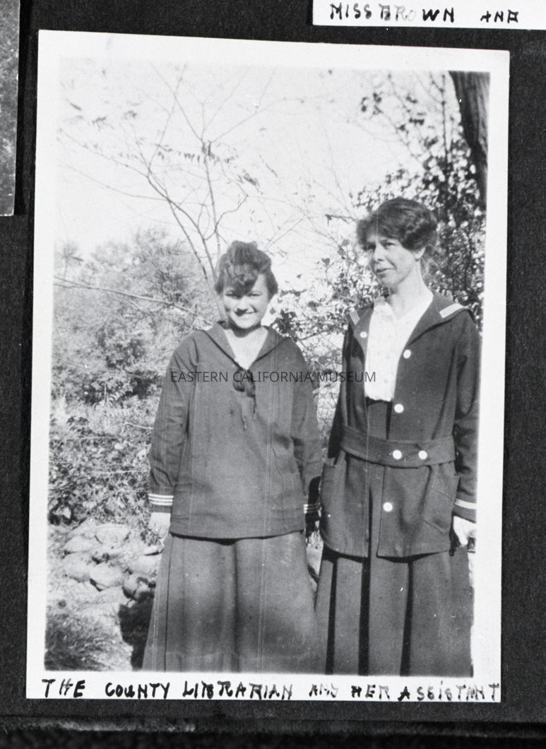 Photo taken of a photo in an album. It is of two women standing outside. Someone has written along the bottom edge of the photo, "The County Librarian and her Assistant." The woman on the right is Miss [Blanche?] Chalfant.