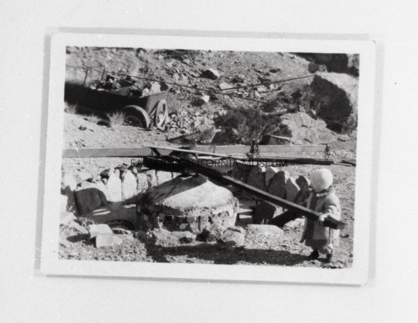 Accession information says, "Stamp mill, 1925." However this image does not match that description. This is a photo of a small child and arrastra, 1925.