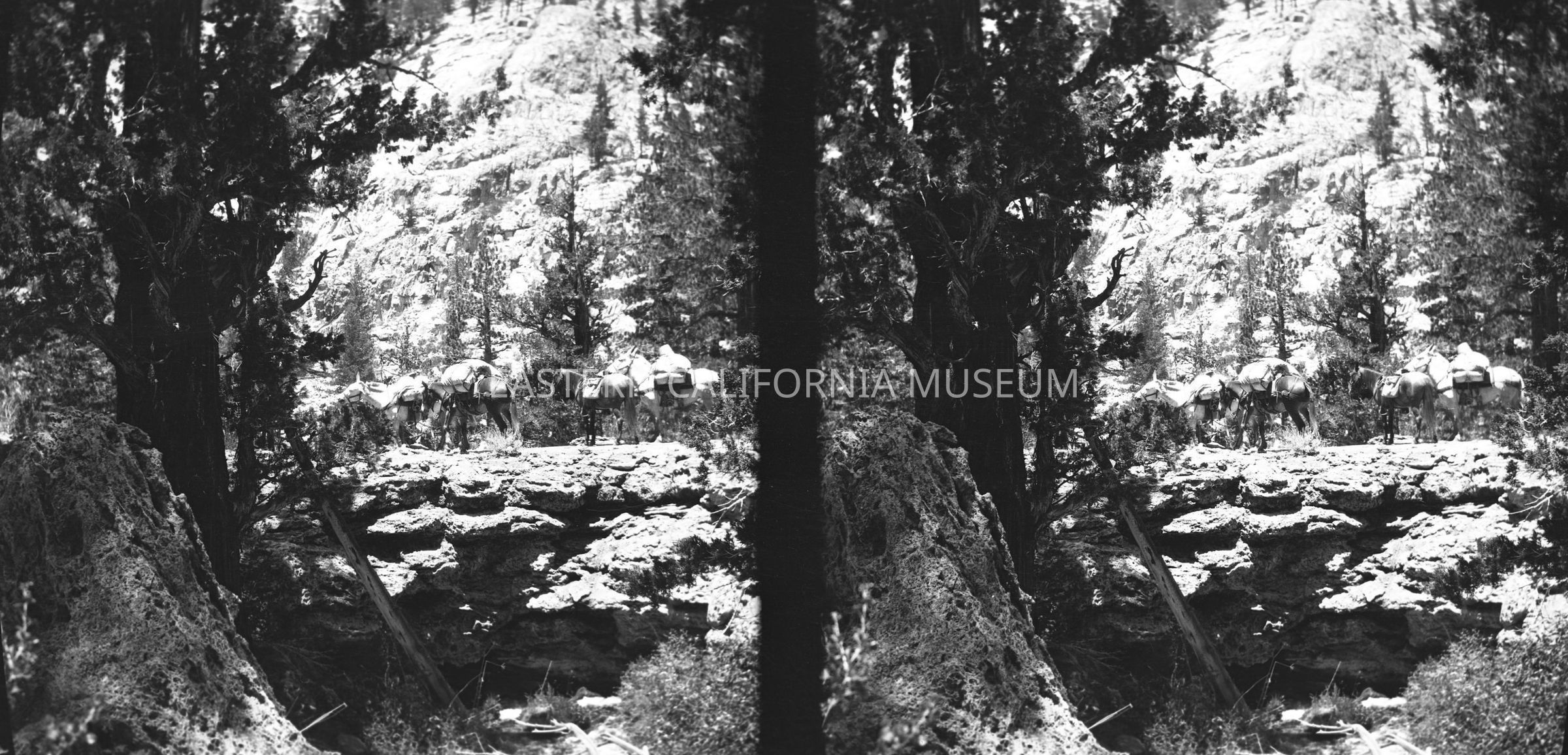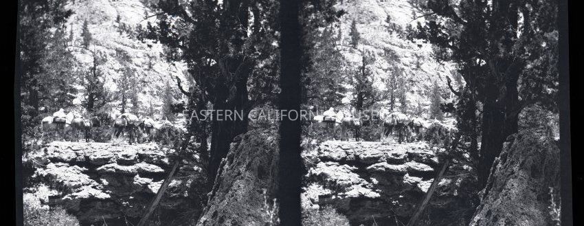 Negative of a stereoscopic image of a packtrain near a cliff or crevasse. It looks to be volcanic rocks (lava?). Maybe the Mono County or Mammoth area?Made/Created
