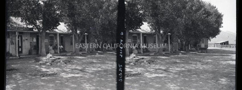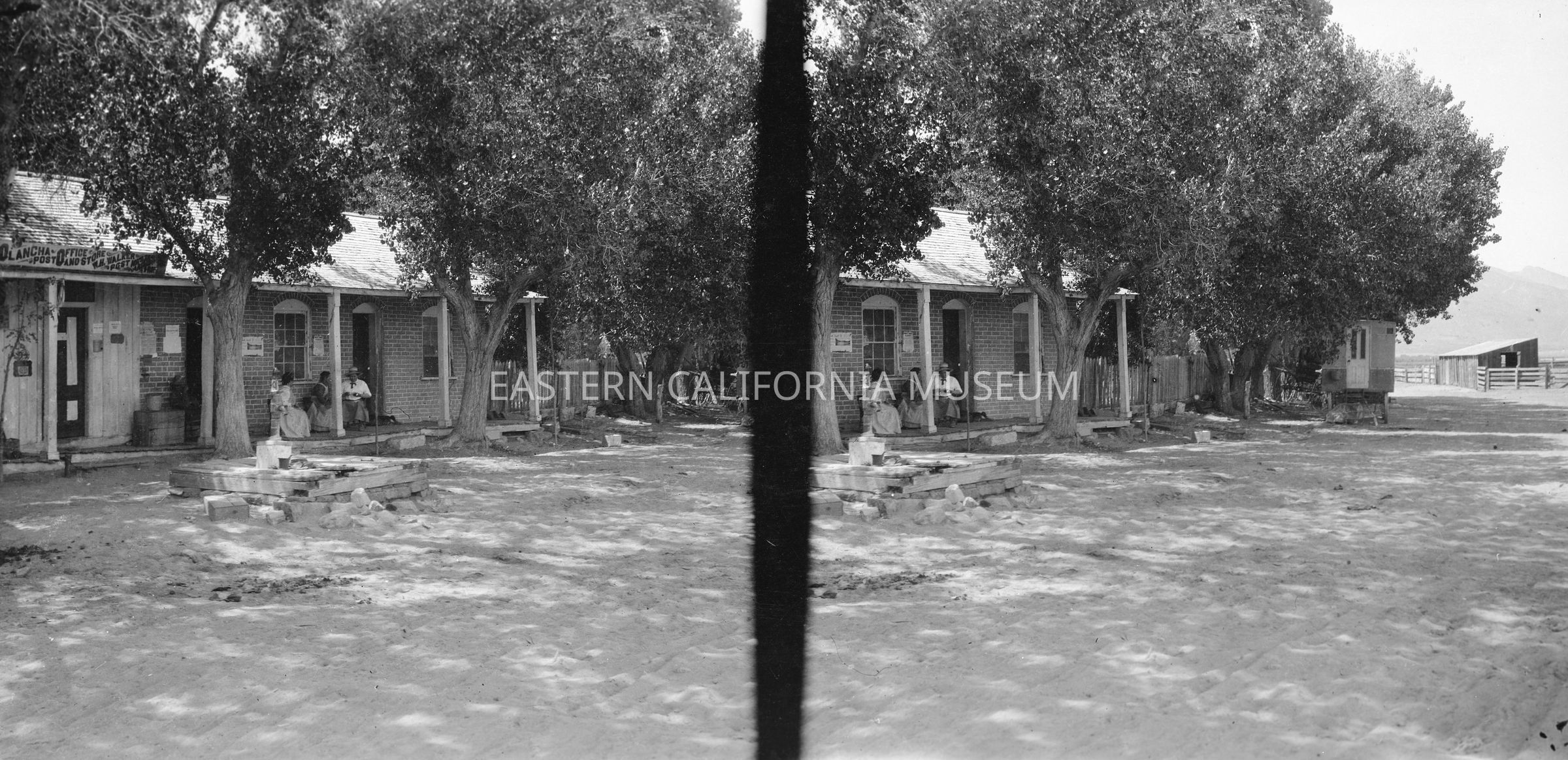 Negative of a stereoscopic image of the Olancha Post Office and Store. There are three people sitting on the porch and Matt's travelling darkroom wagon is visible in the background.Made/Created