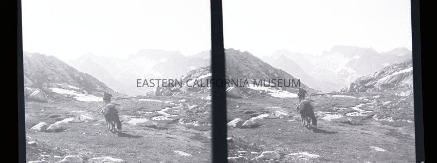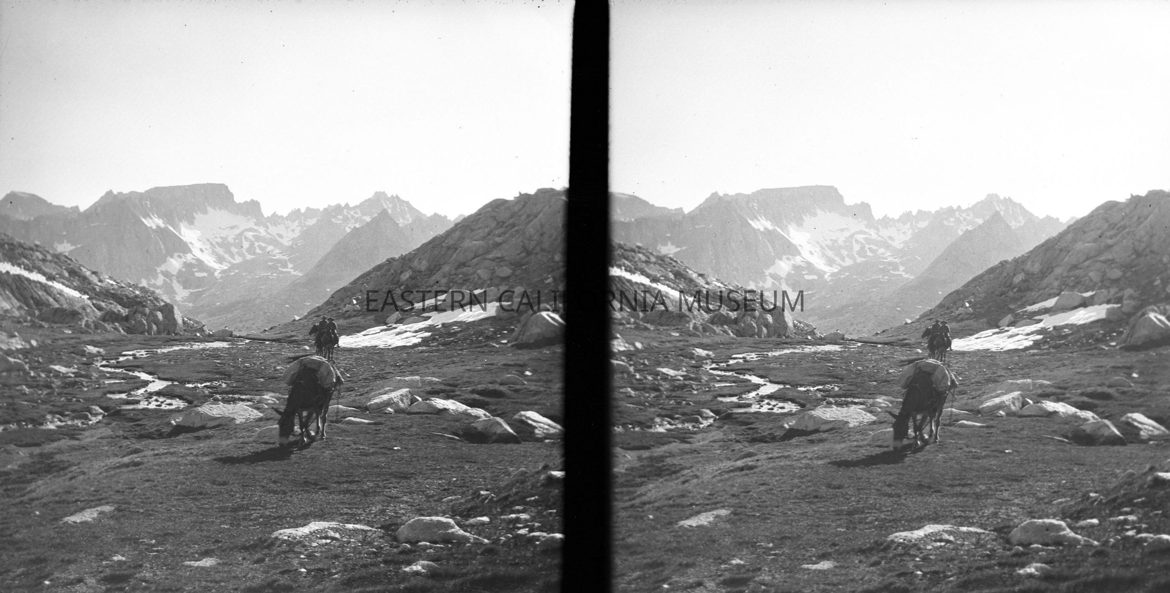 Negative of a stereoscopic image of a packtrain in an open clearning. No shrubs or trees, but maybe grass/moss and a small stream to the side. Snow-capped mountains in background.Made/Created