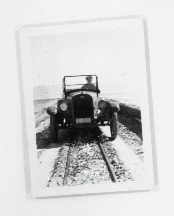 Trona, CA, 1925. Size of rail in comparison to auto wheels.