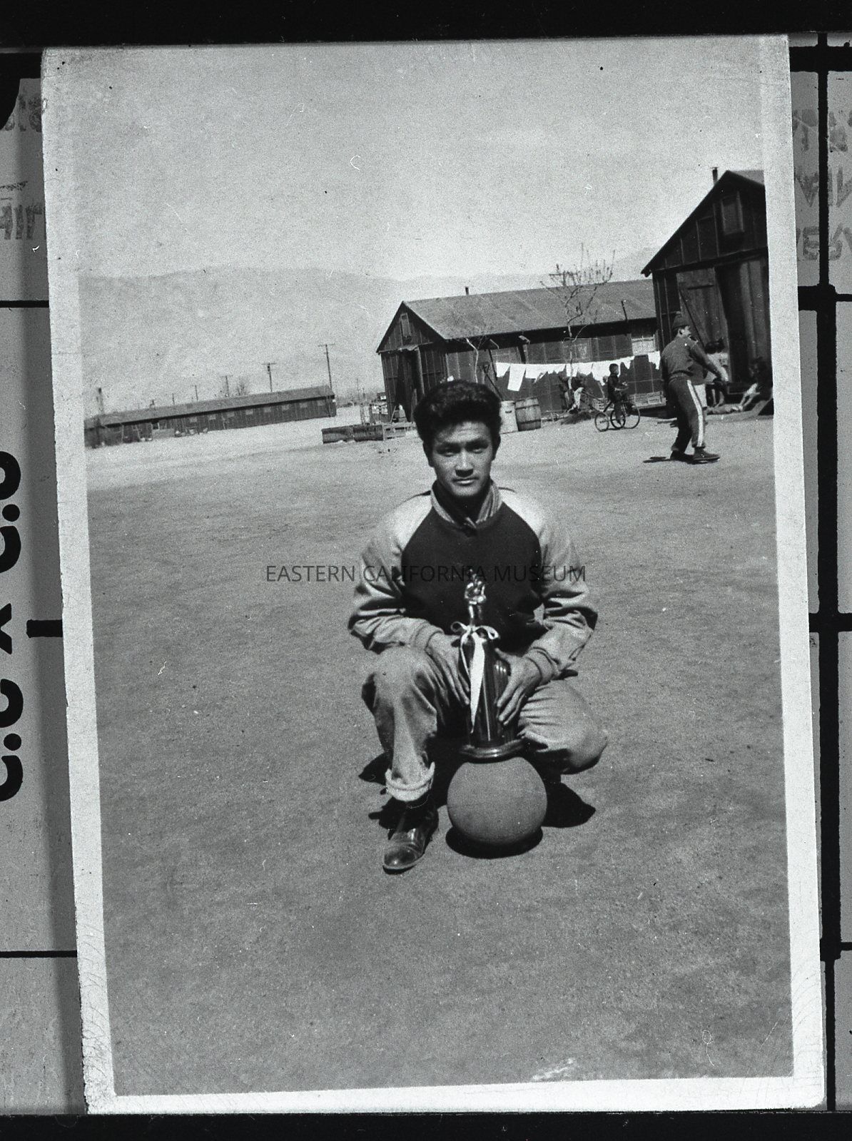 Negative of a young man kneeling down with a ball and trophy. There are barracks behind him, and a line of laundry hanging between them.There is also a little boy on a tricycle.Photograph Details