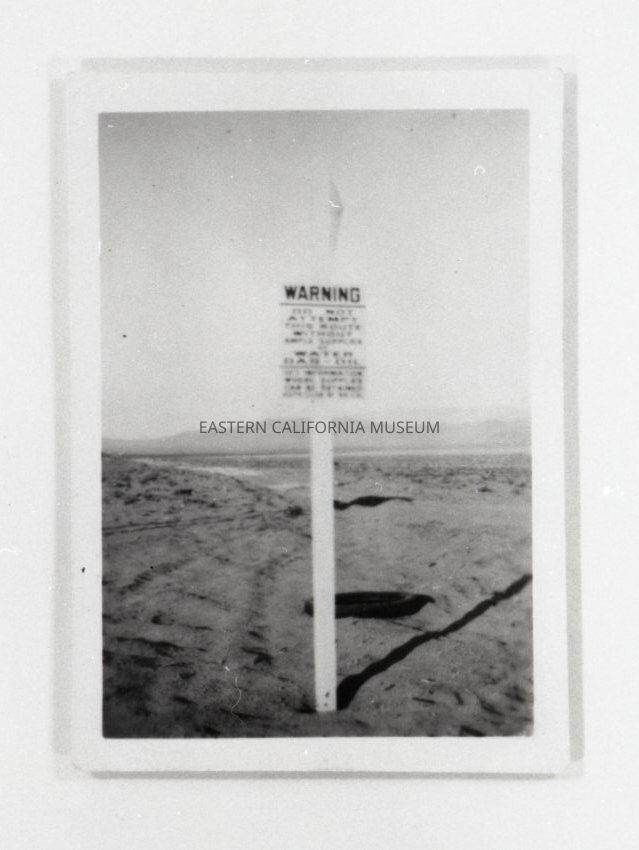 Sign says: Do not attempt this route without ample supplies of water, gas, and oil. Warning you are entering Poison Water Canyon.