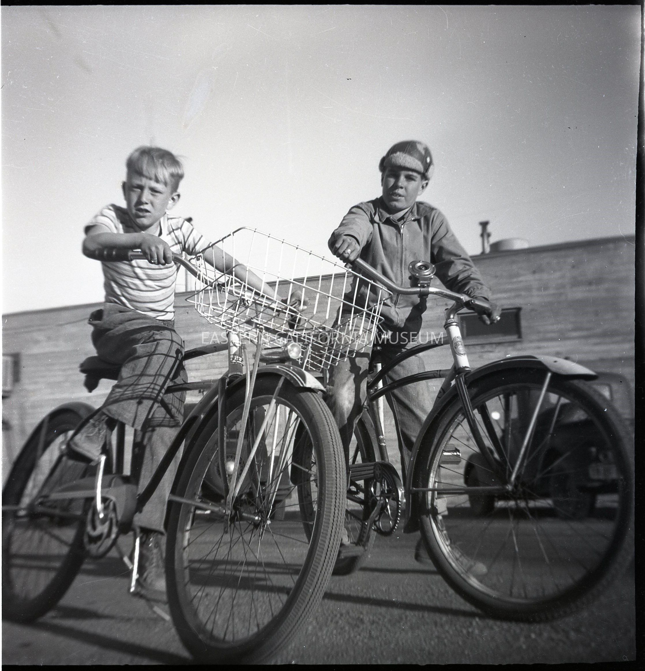 Negative of two unidentified young boys posing for the camera with their bikes. There is a long building behind them. The boy on the right is wearing a leather hat.Collection