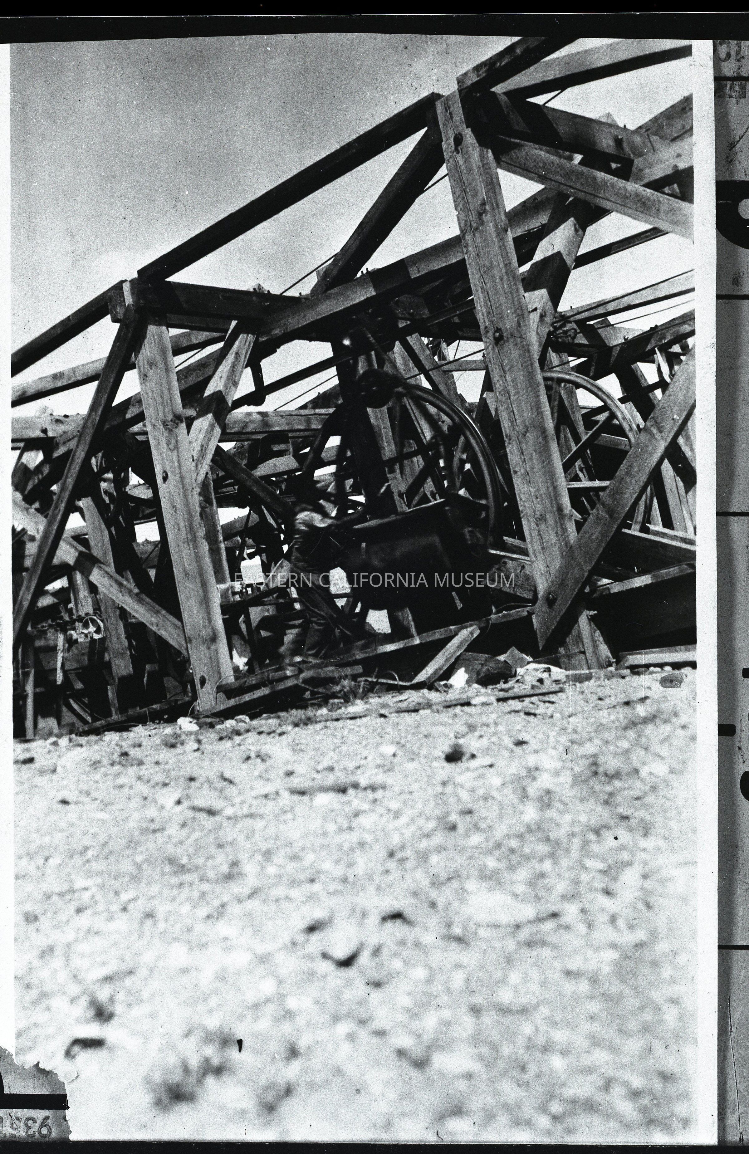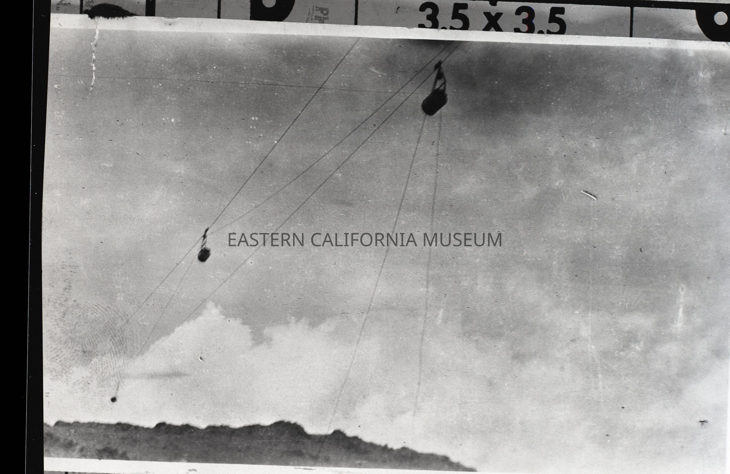 Two negatives of the Saline Valley Salt Tram. 2023.0.294--Man working next to a large wheel. 2023.0.295--Two buckets in the air.