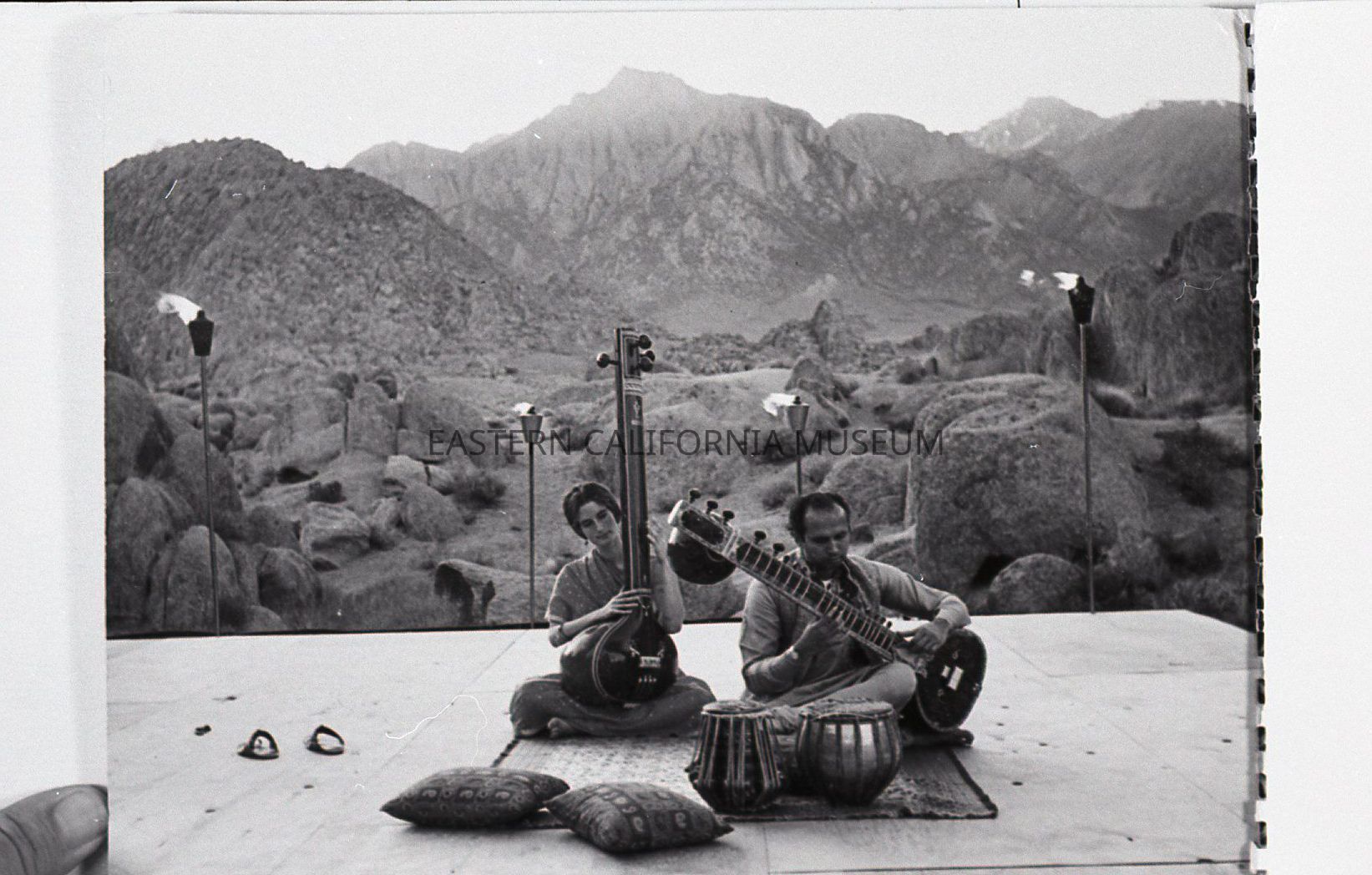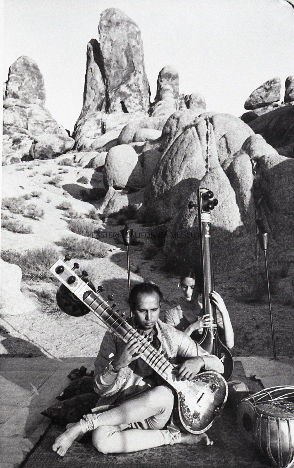 2023.0.396--Man and woman playing sitar on stage. Likely Ravi Shankar's Kinnara School of Indian Music.