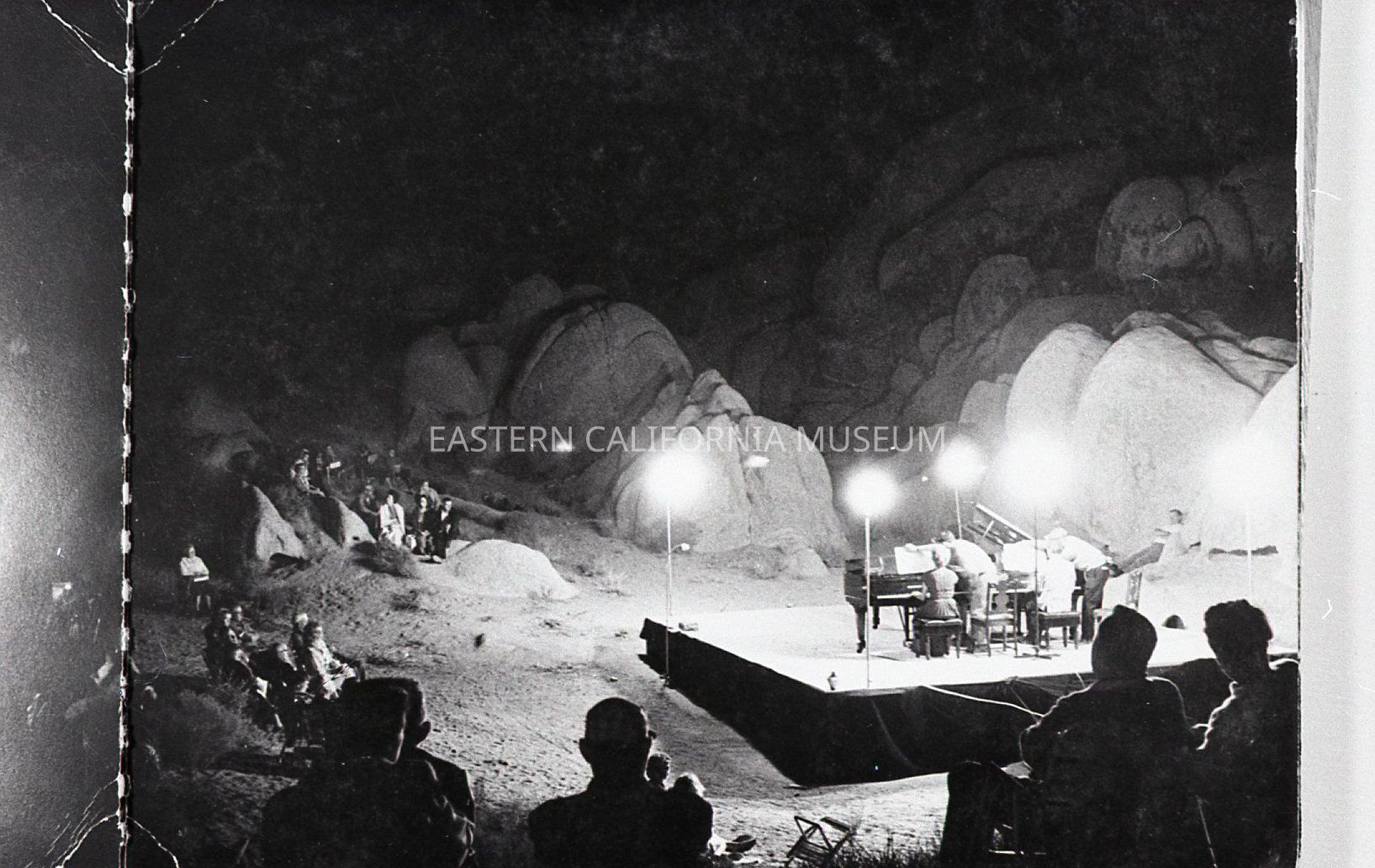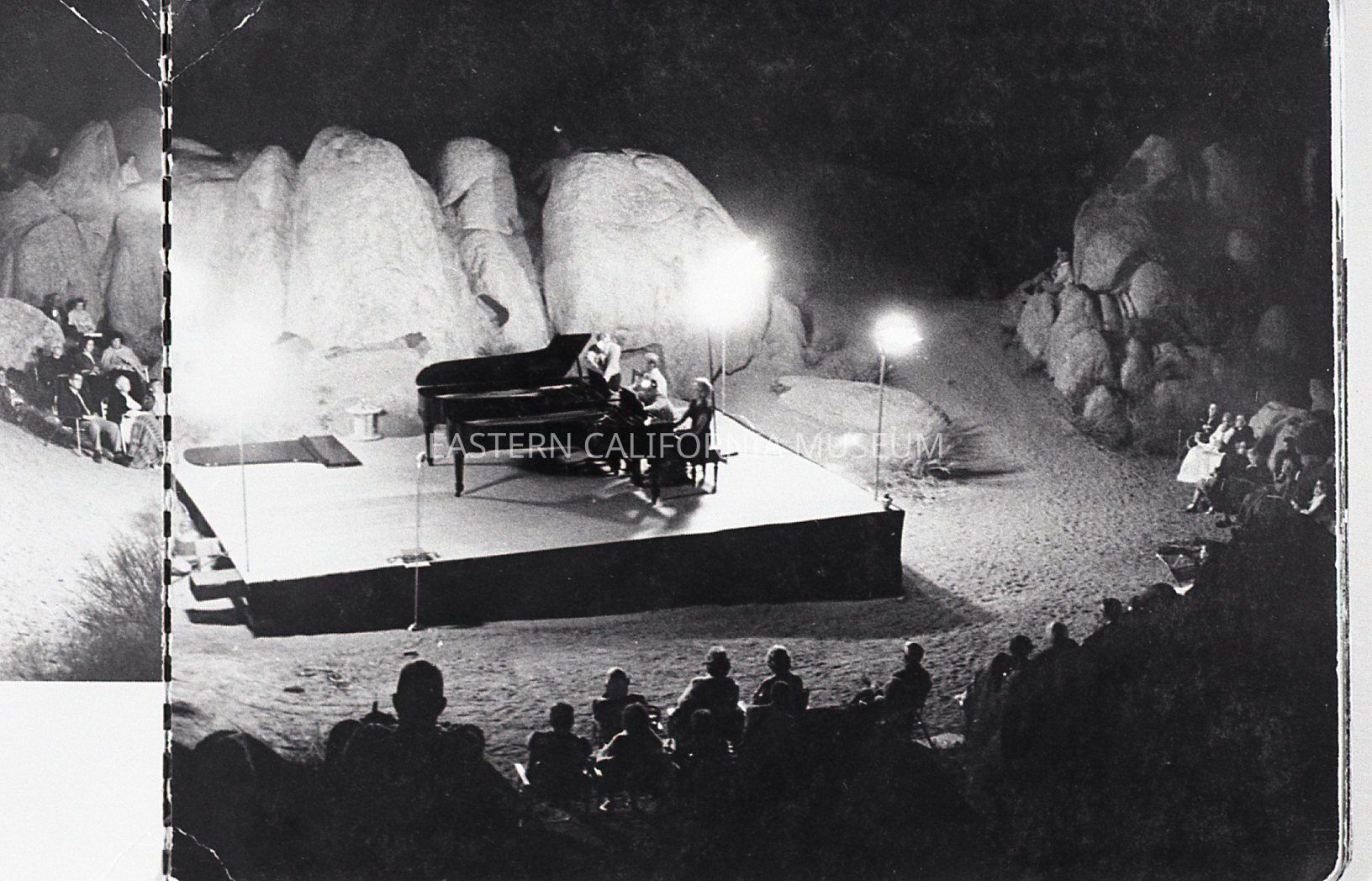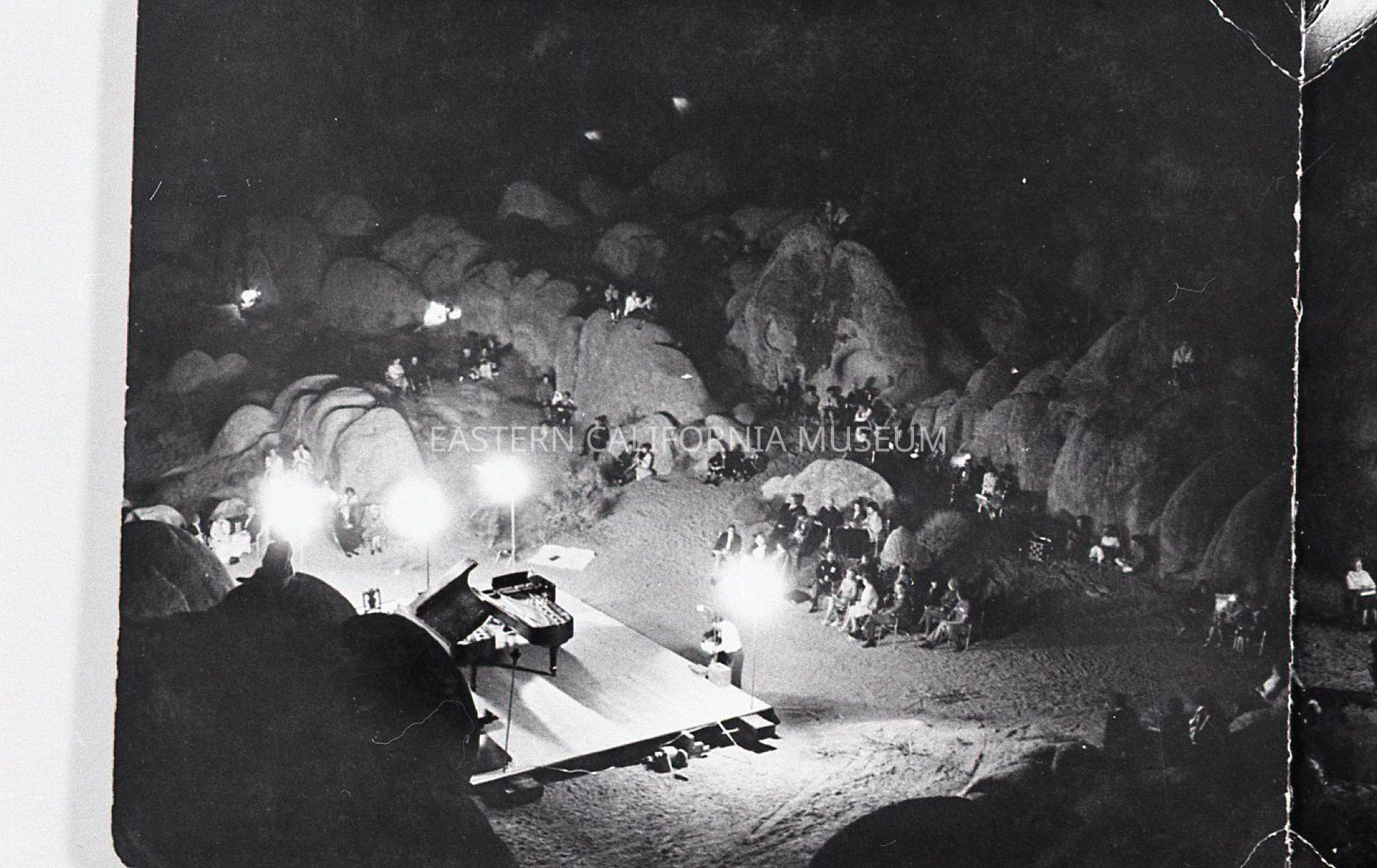 2023.0.398--Night photo of two pianos on stage with audience sitting among the rocks.
