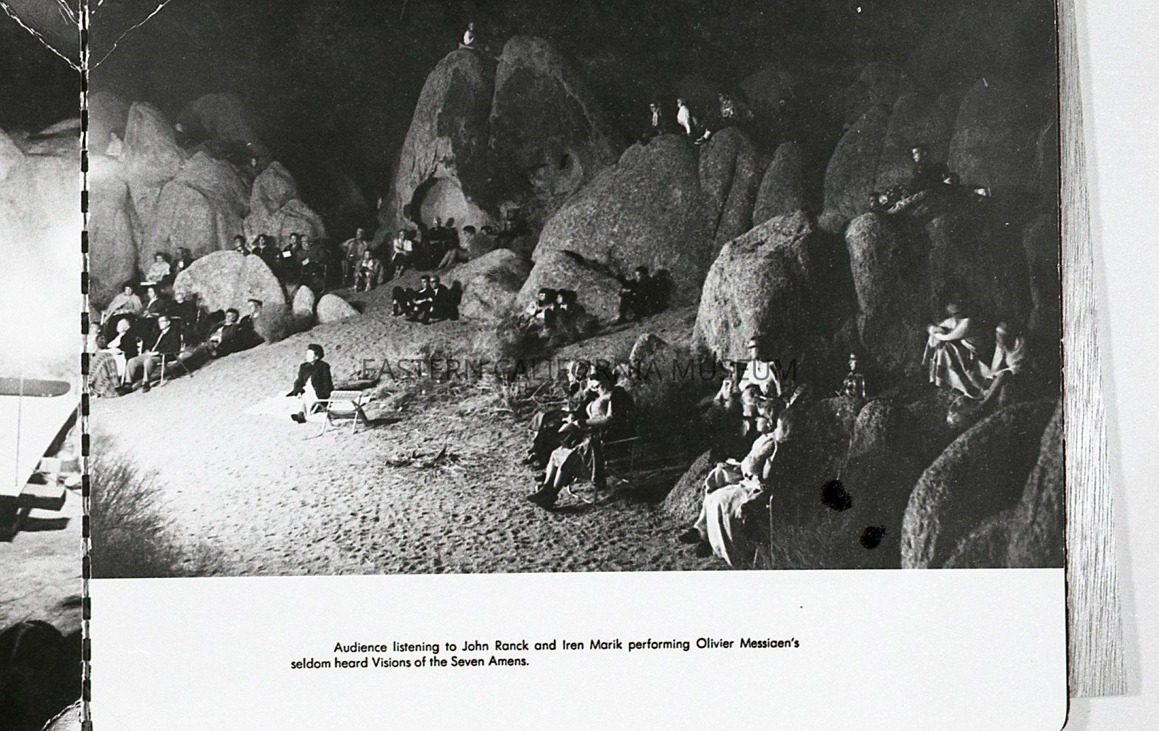 2023.0.402--Night photo of the audience sitting among the rocks. Page has caption: Audience listening to John Ranck and Iren Marik performing Olivier Messiaen's seldom heard Visions of the Seven Amens.Photograph Details