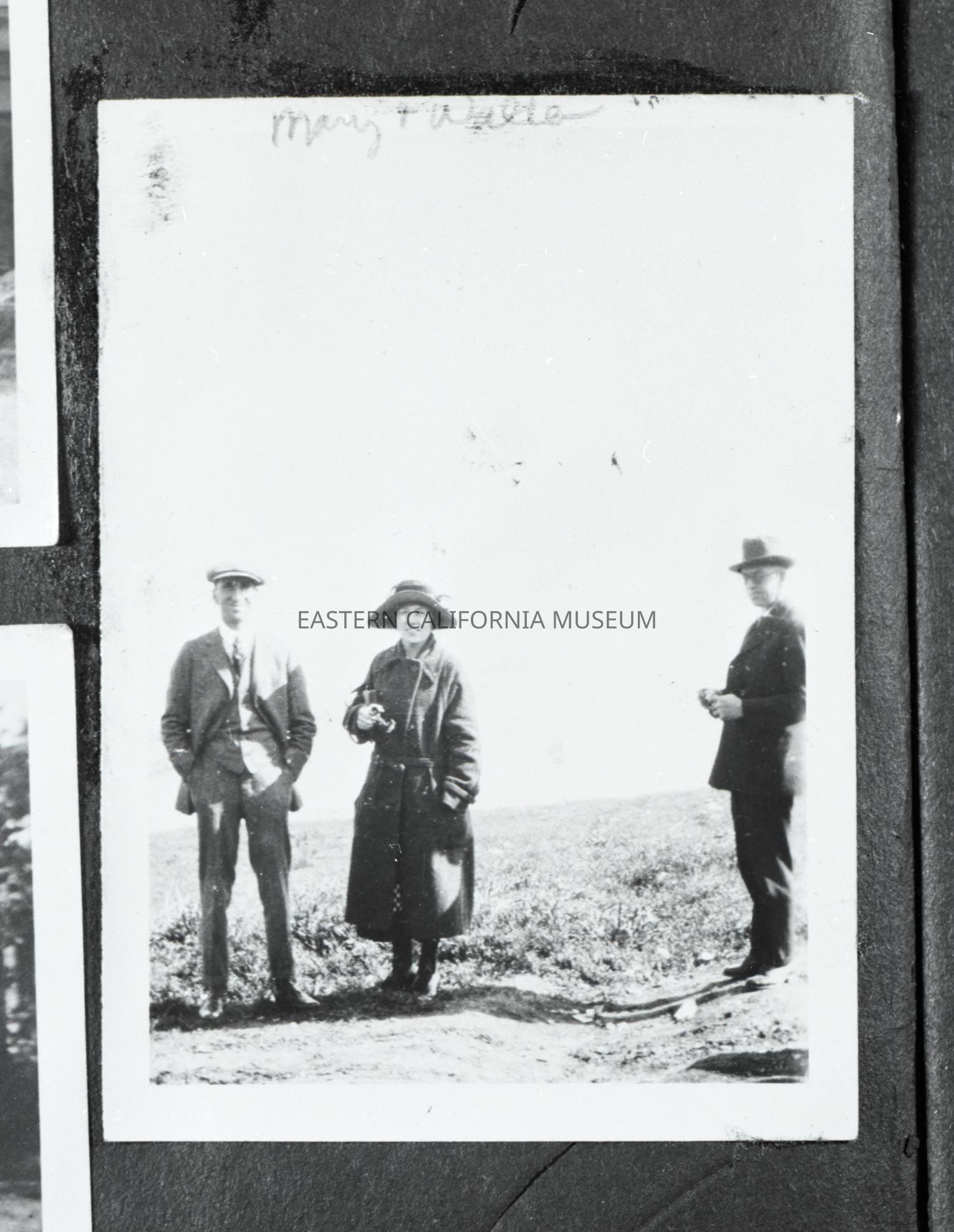 Photo taken of a photo in an album. It is of three people (two men and a woman) standing outside in a field. They are identified as Mary [Singlaub Levy Gillespie] and Walter [Levy]. The second man is unidentified. The location may be Manzanar.