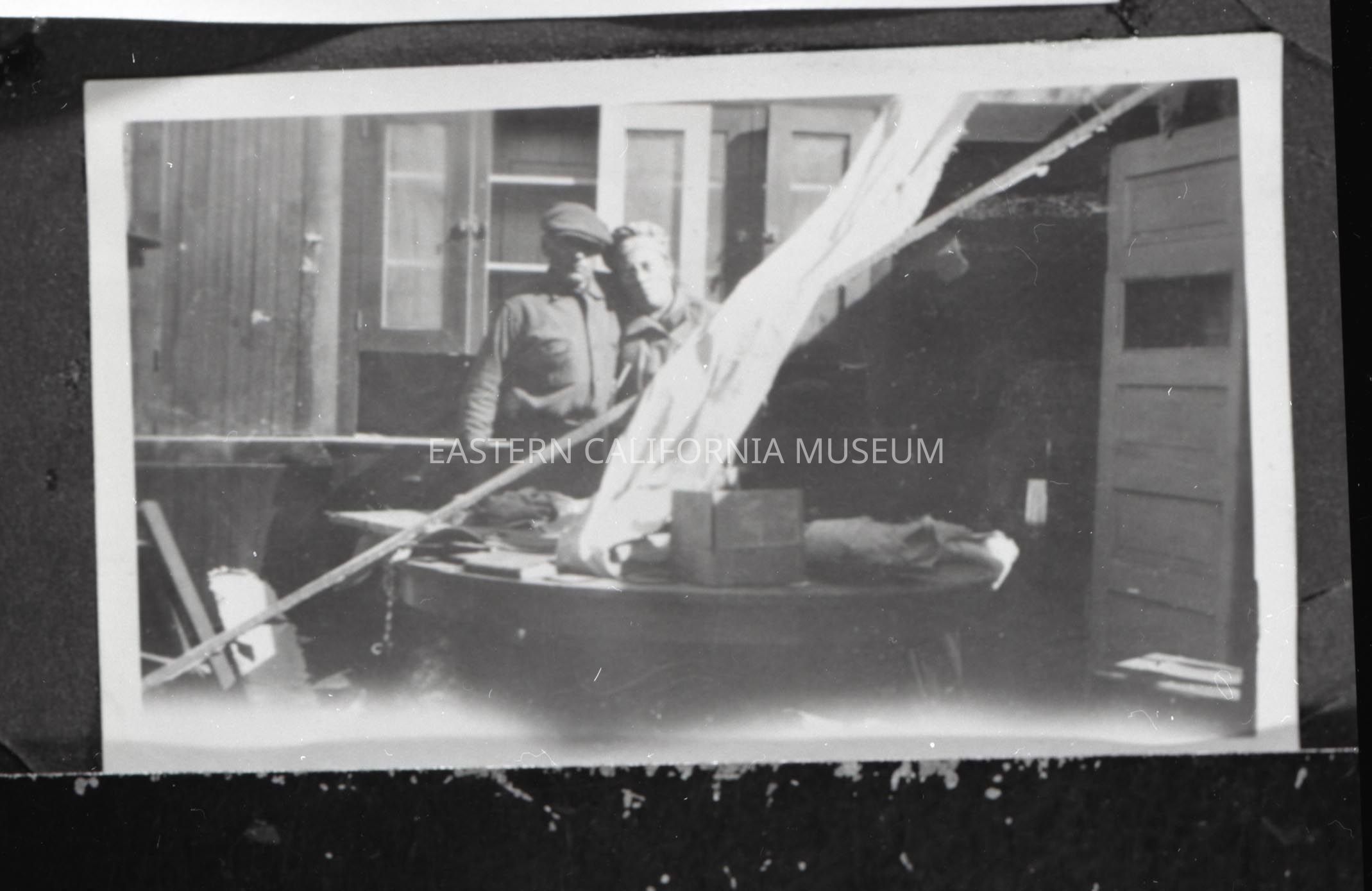 Photo taken of a photo in an album. It is of a man and woman standing inside a house that has suffered damage, likely from the devastating wind storm of 1923. The location may be Manzanar.