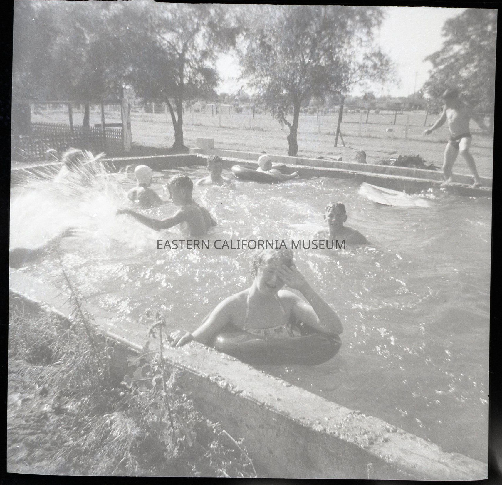 Negative of a group of at least nine people splashing about in a swimming pool or reservoir.