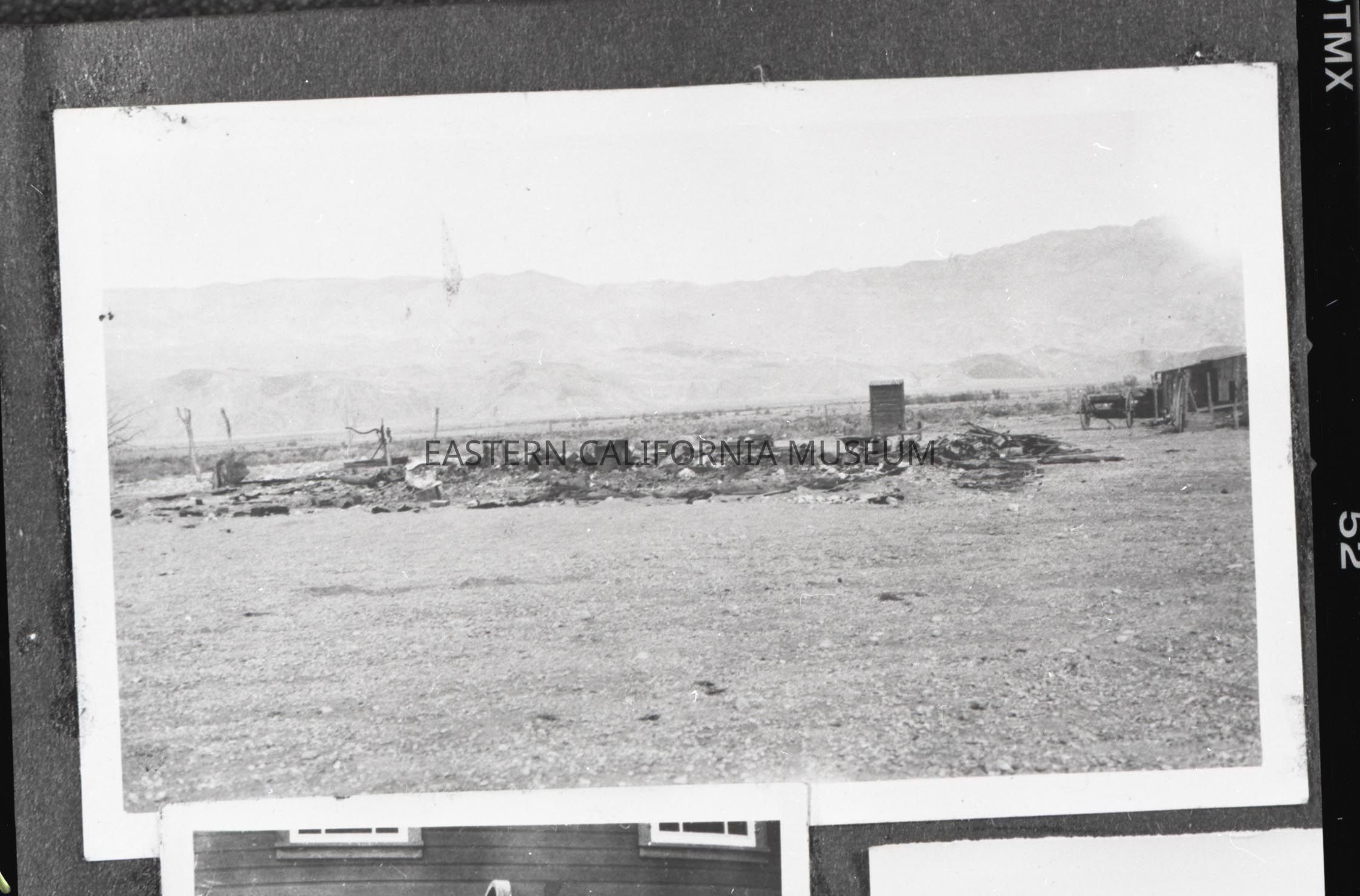 Photo taken of a photo in an album. It is of a pile of rubble, likely caused by the devastating wind storm of 1923. The Inyo Mountain range is in the background. The location may be Manzanar.