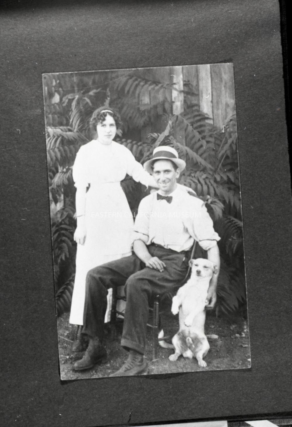 Photo taken of a photo in an album. It is of a man, woman, and dog (possibly Mary and Walter Levy?). The man is wearing a straw boater hat, bow tie, and has his shirt sleeves rolled up while sitting in a chair. It is staged to look like a studio portrait. Location may be Independence.
