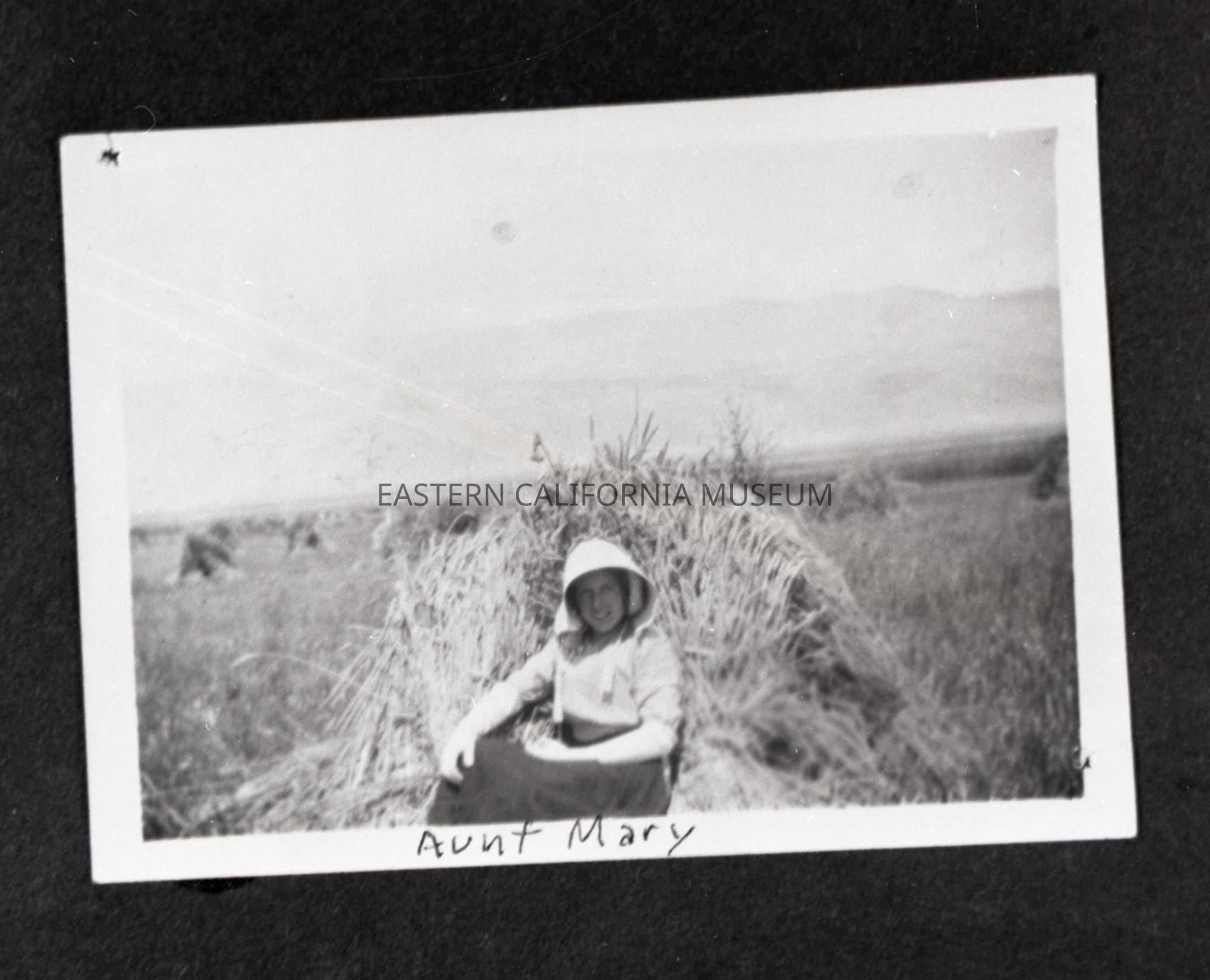 Photo taken of a photo in an album. It is of a woman identified as Aunt Mary sitting or leaning against a pile of hay or alfalfa or some sort of harvest in a field. The Inyo mountain range is in the background. Location may be Manzanar.