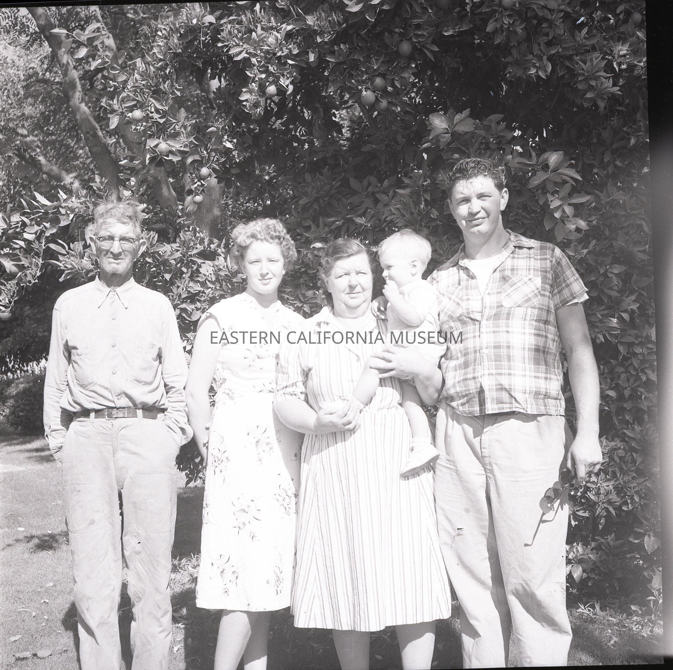 Negative of a group of five people. The man on the the right end is likely Marvin Donald Smith, the old man on the left may be Grover Smith, and the older woman in the center may be Ora Smith. The young woman and baby are unknown.