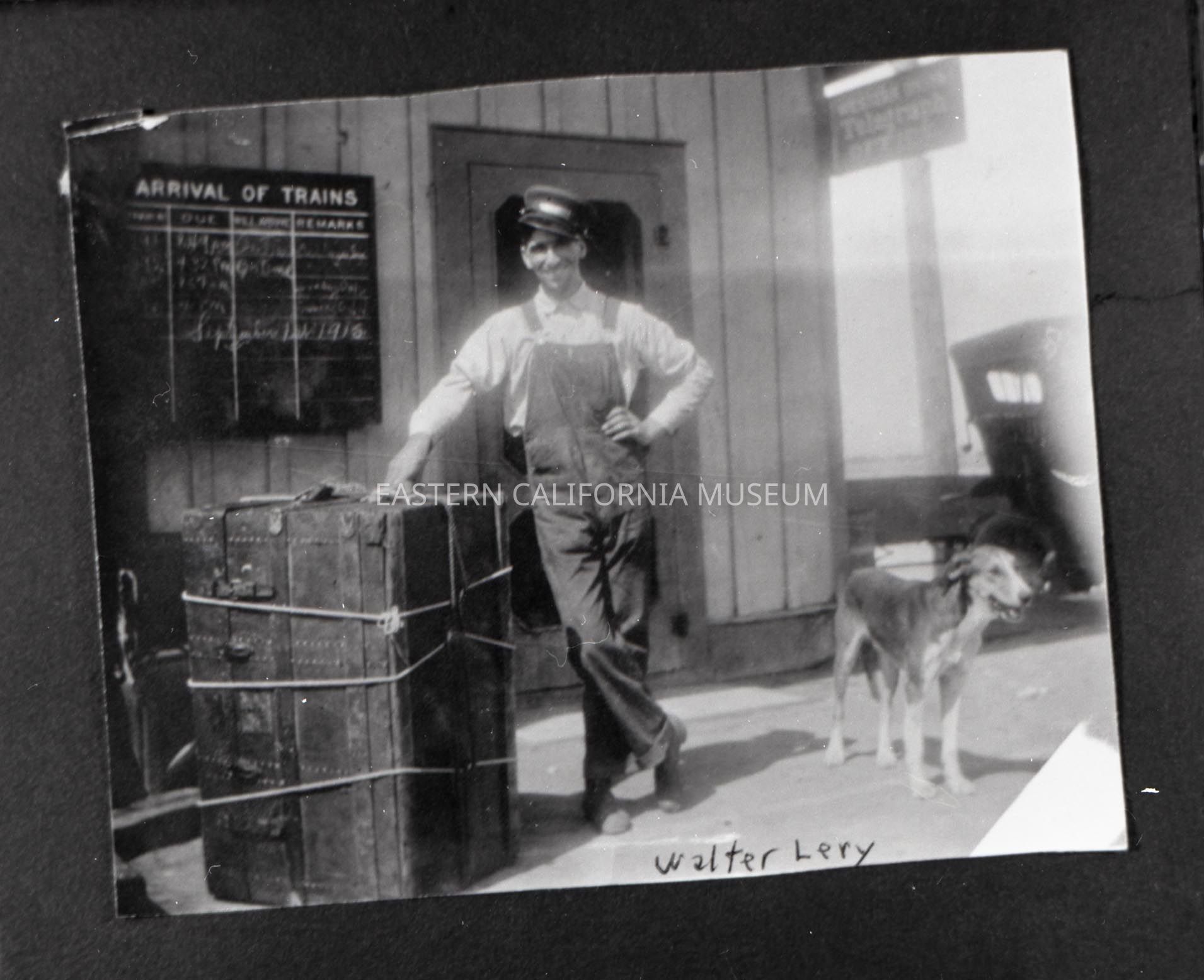 Photo taken of a photo in an album. It is of a man identified as Walter Levy leaning against a travelling trunk on the platform of a railroad station. He is wearing overalls and a train employee's hat. There is a dog beside him, and what looks like an early vehicle in the background. There is a sign for the Western Union Telegraph Office hanging in the upper right corner. On the side of the building is a sign that says, "Arrival of Trains" and has the date September 1, 1915 written at the bottom. Someone has identified the location as the Kearsarge Station.