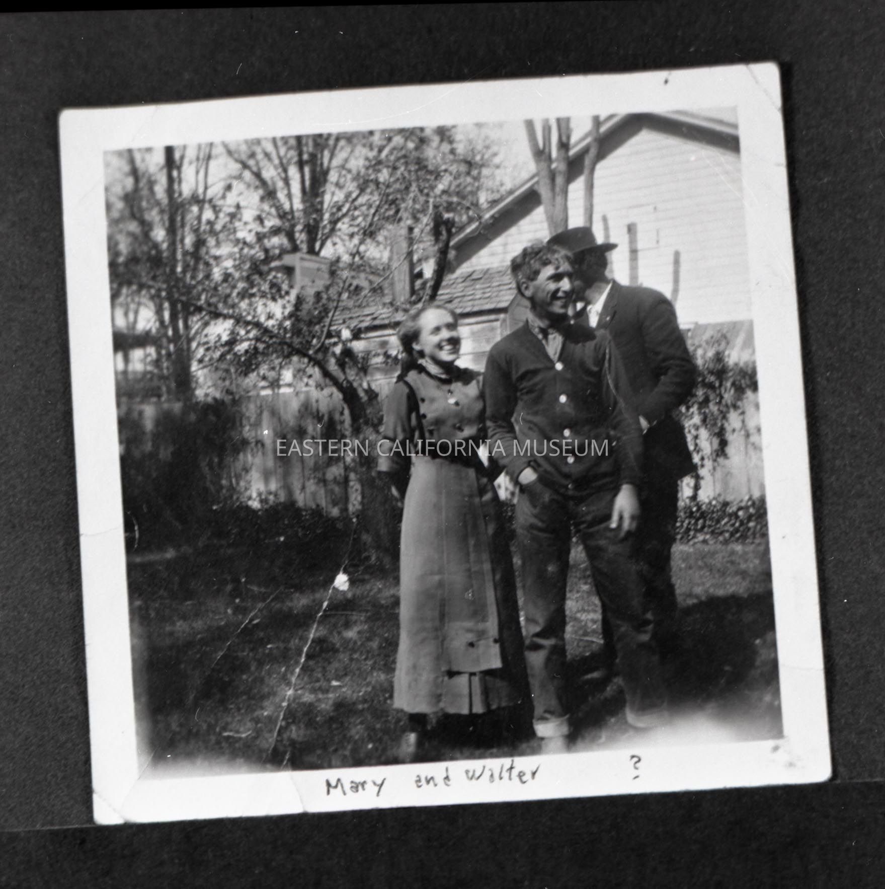 Photo taken of a photo in an album. It is of three people (two men and a woman) standing on a grassy lawn with a fence and house in the background. The smiling couple in the foreground are identified as Mary and Walter [Levy], but the man partially hidden behind them is unidentified.