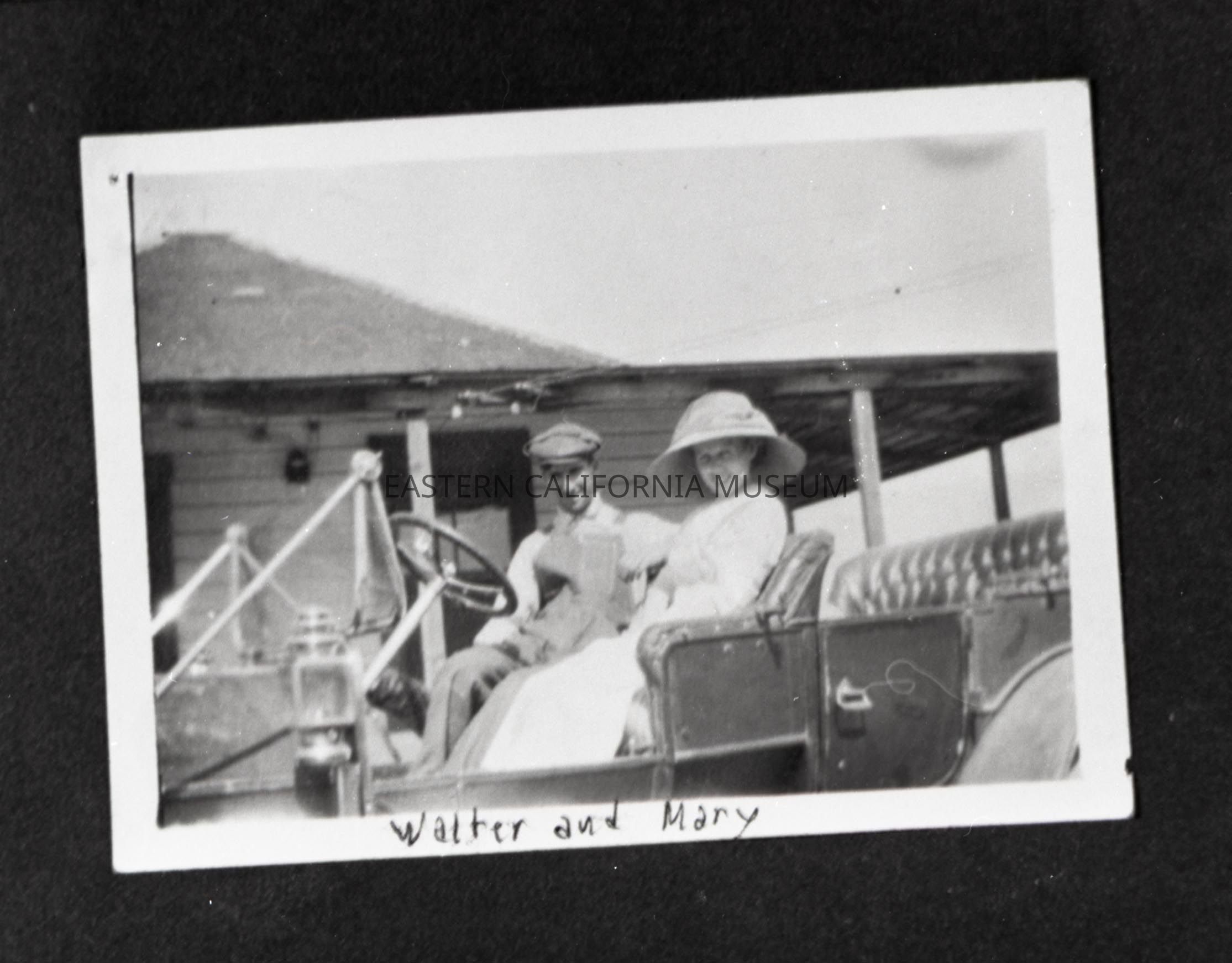 Photo taken of a photo in an album. It is of a young couple sitting in an early open-top vehicle in front of a house. They are identified as Walter and Mary [Levy].