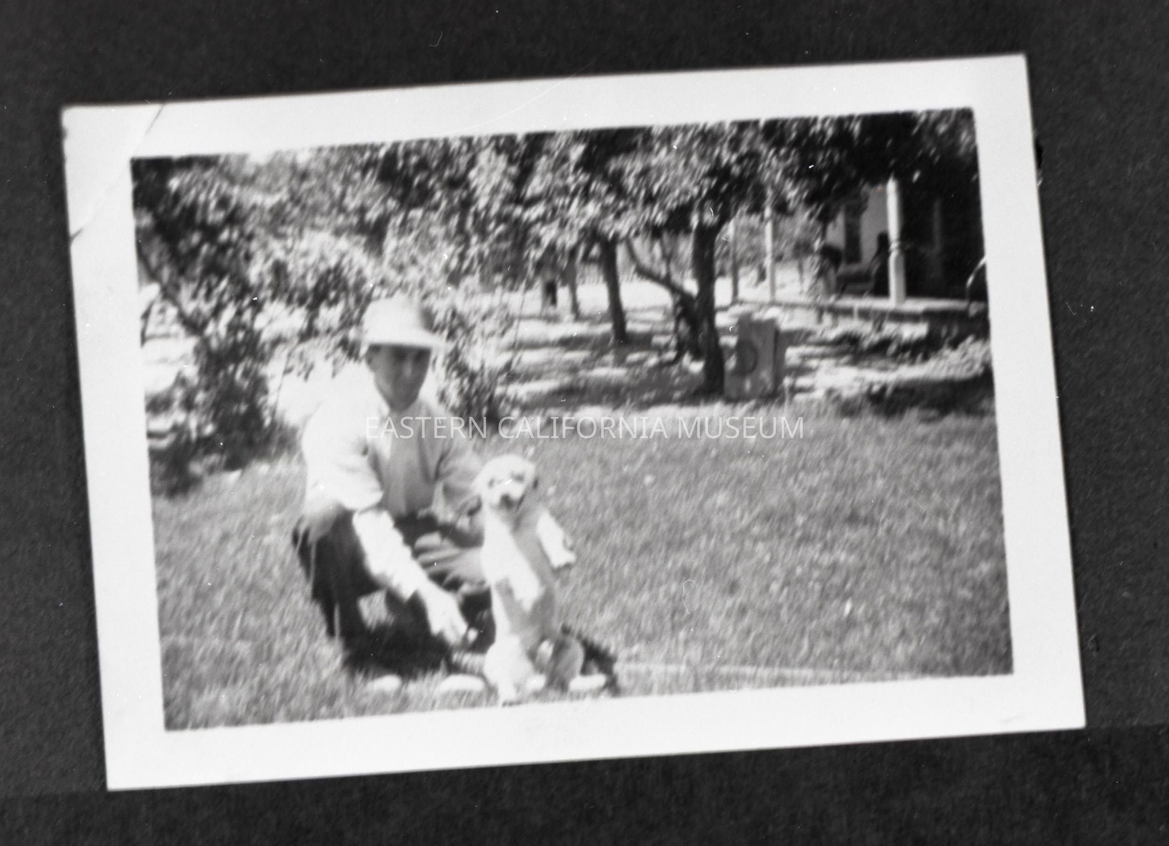 Photo taken of a photo in an album. It is of a man with a dog. They are in a grassy lawn with an orchard and house behind them. He is likely Walter Levy.
