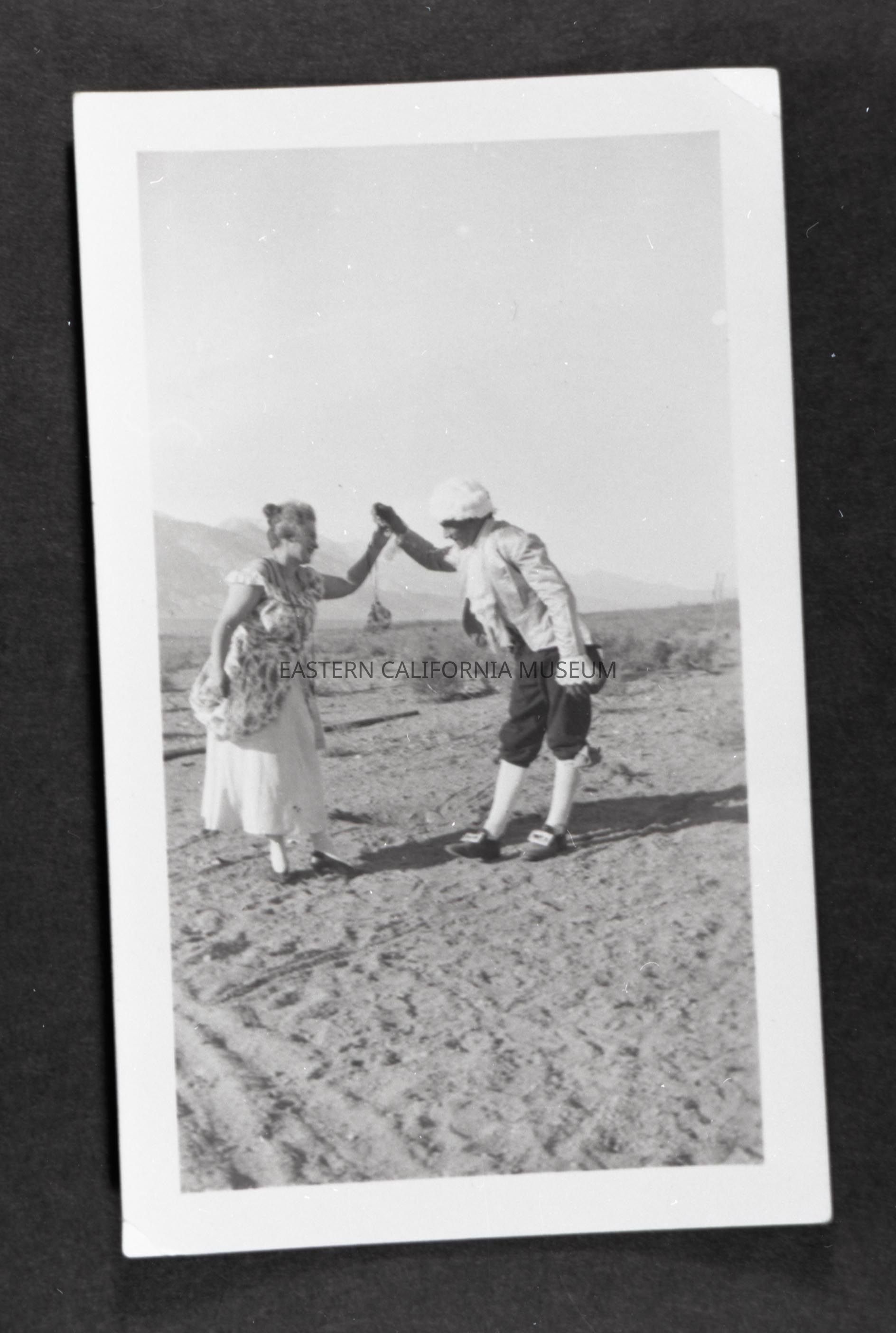Photo taken of a photo in an album. It is of a couple wearing historic costumes dancing in the desert with mountains in the background.