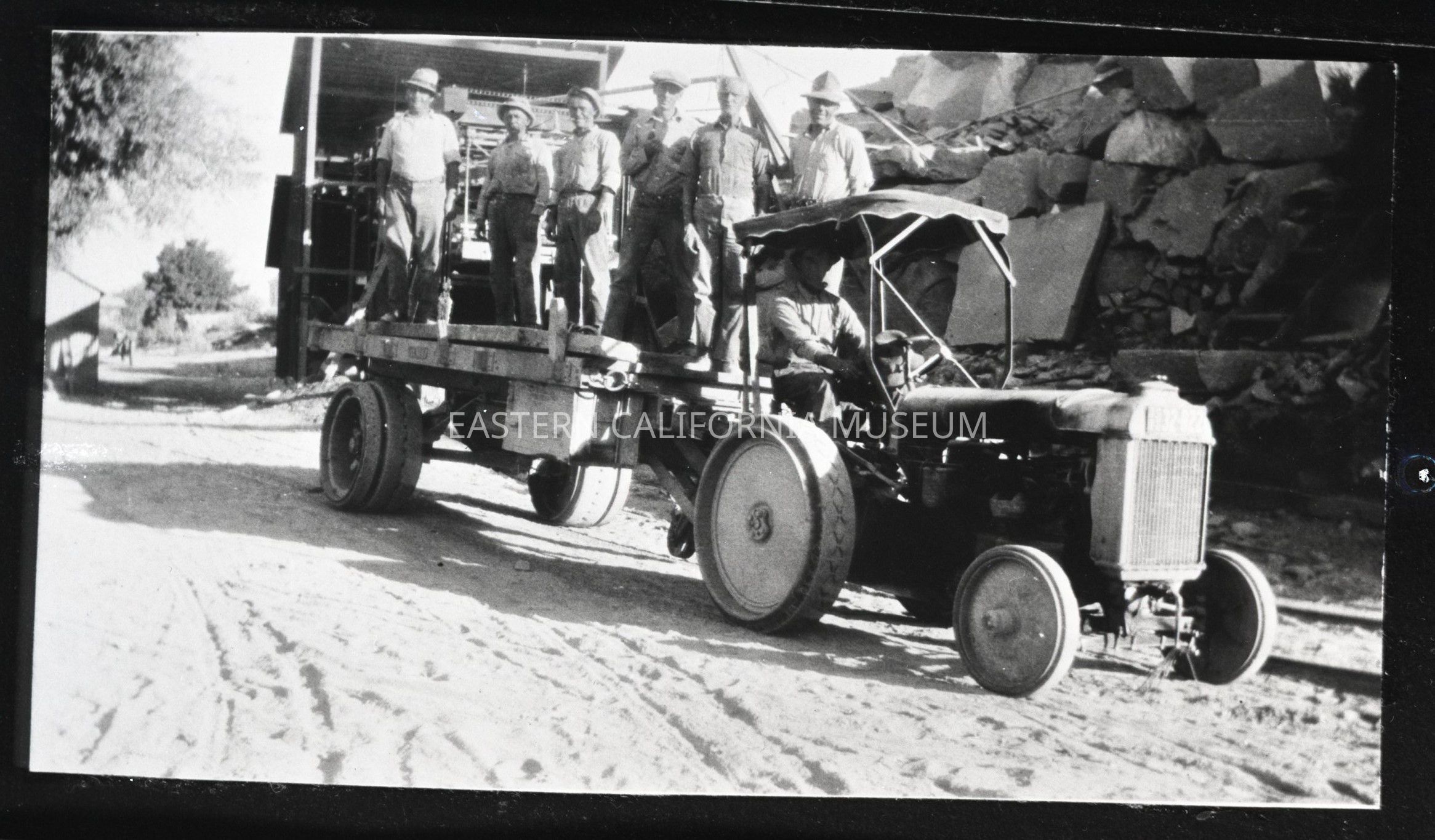 Negative of a tractor hauling several workers on a flatbed at the quarry at Round Valley, circa 1923.