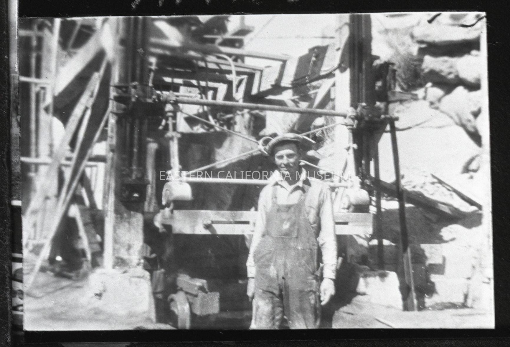 Negative of a man identified as Arthur standing in front of some equipment at the quarry in Round Valley, circa 1920s.