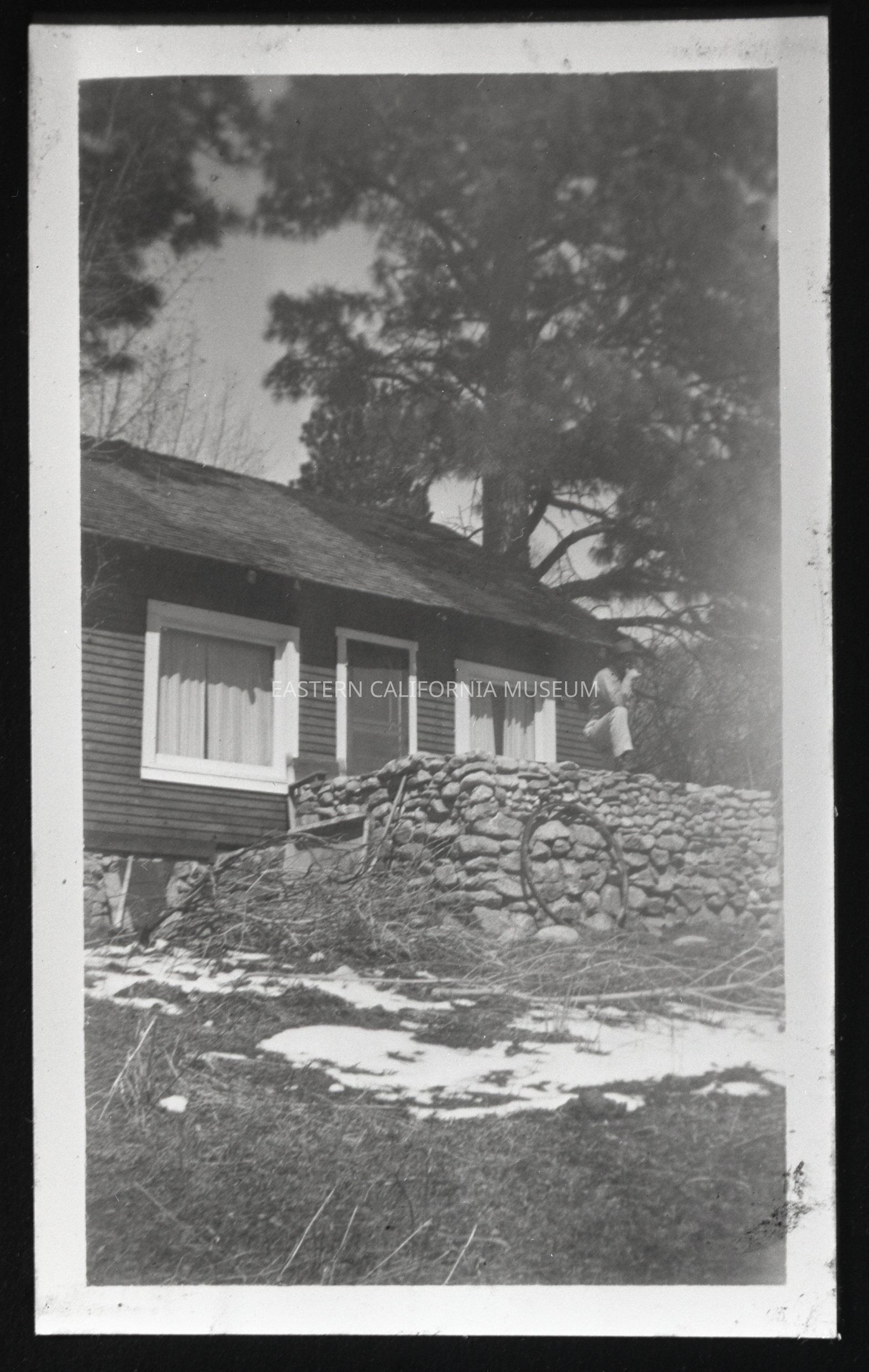 Negative of an unidentified man (maybe a member of the Jewett family?) posing with his foot propped up on the wall of a stone patio attached to a cabin at Seven Pines. The house was from Manzanar, and this photo is circa 1933. There is a small patch of snow on the ground.Photograph Details