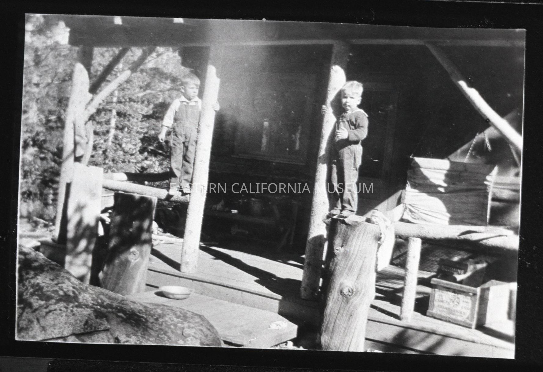 Negative of two young children identified as Howard and Don Jewett standing on the porch railing of a cabin, circa 1925. The location may be Rock Creek.