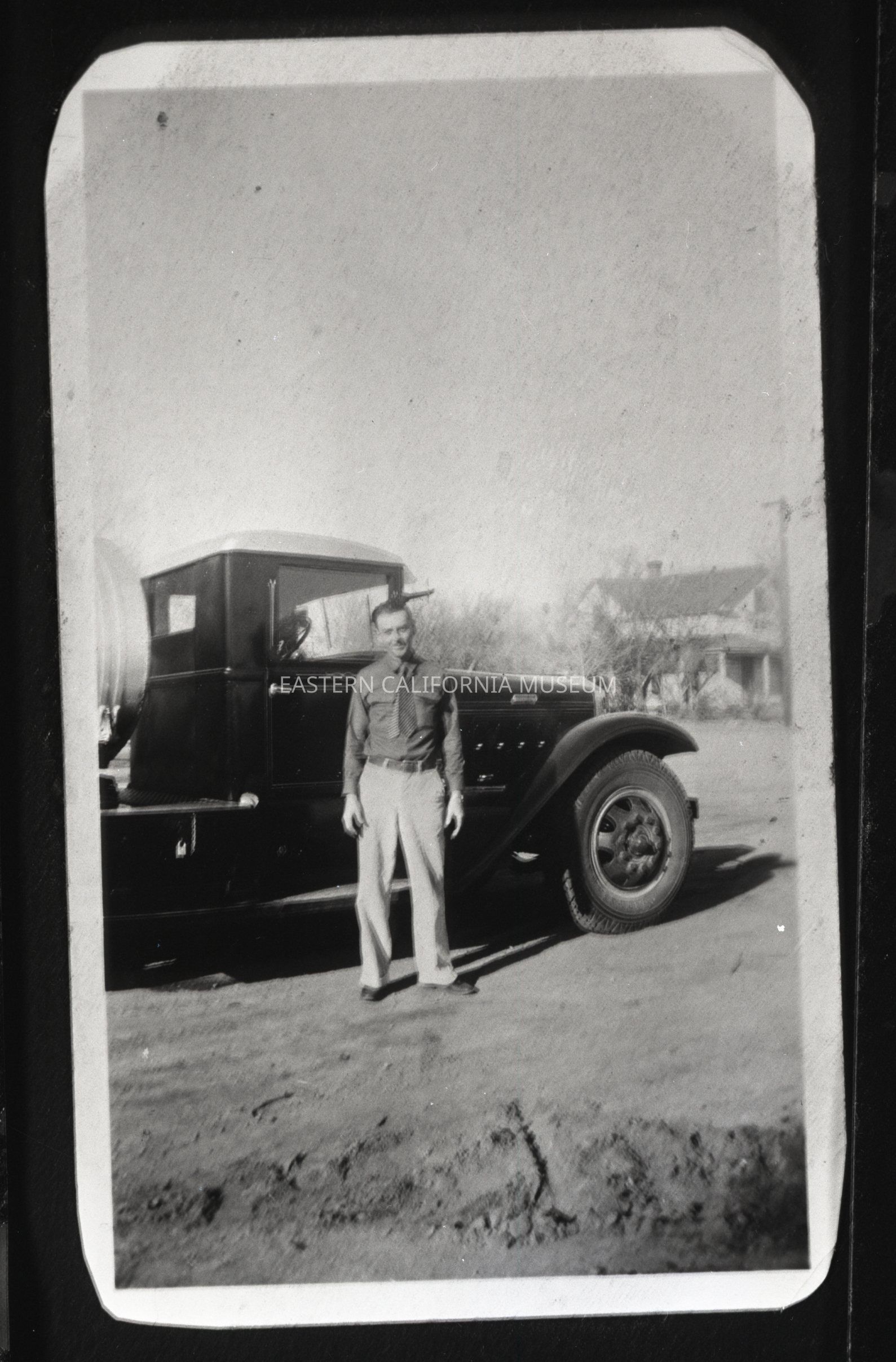 Negative of a man identified as Arthur Jewett standing in front of a truck parked near the Cartier House in Independence.Photograph Details