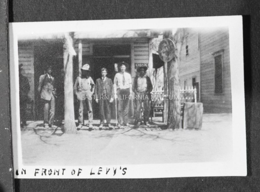 Photo taken of a photo in an album. It is of a group of five (and half of a person on the left side) men standing on the front porch of a store. Someone has written along the bottom edge of the photo, "In front of Levy's." Location is Independence.