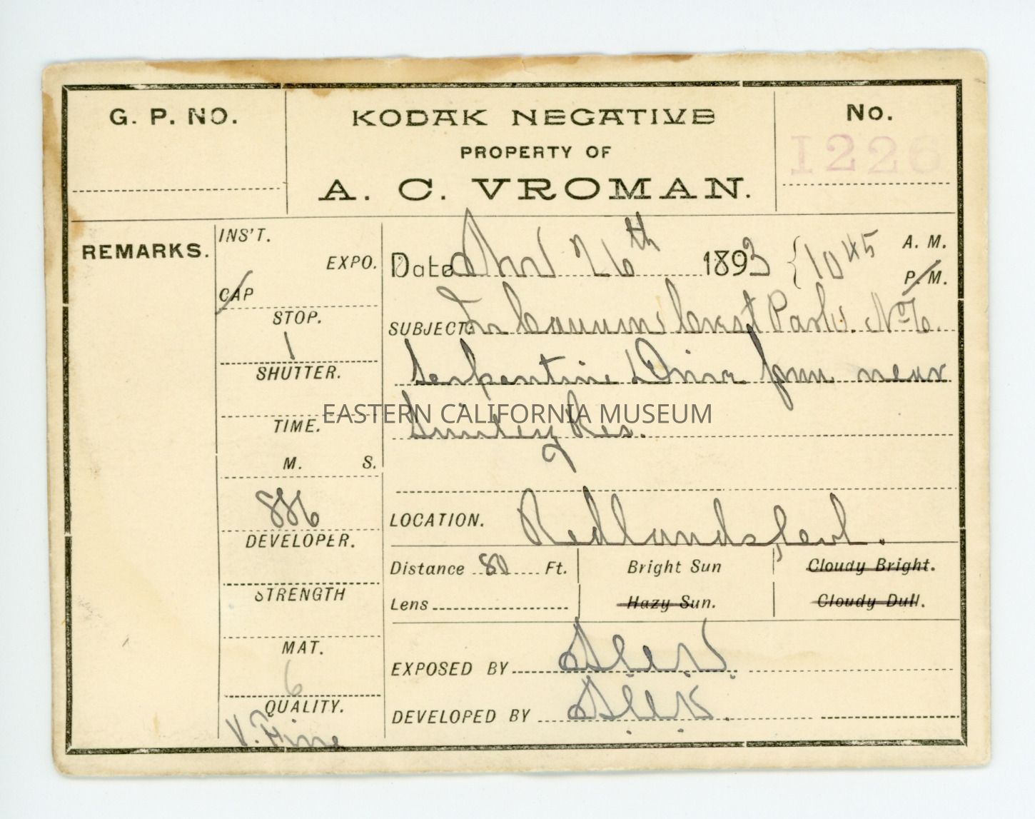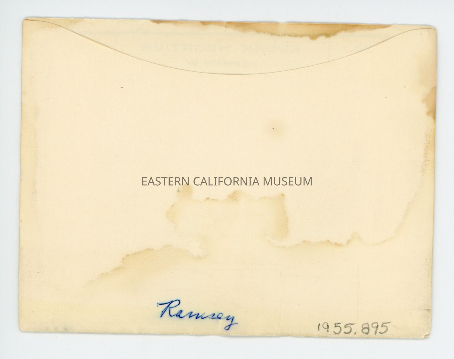Envelope says, "Property of A. C. Vroman" and that the location is Redlands. Written on the reverse in blue ink is "Ramsey." The envelope is water stained.