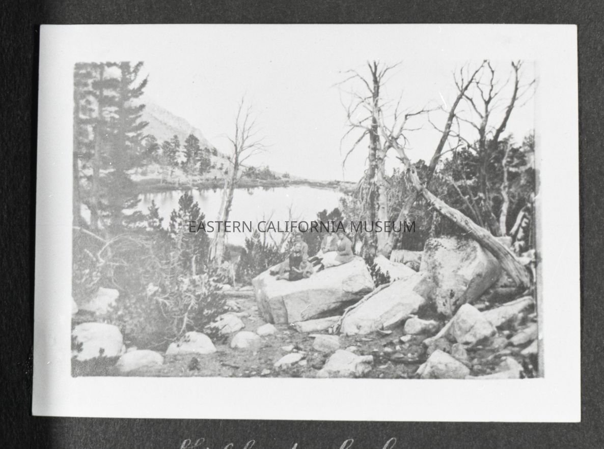 Photo taken of a photo in an album. It is of a group of five people sitting on a large rock near a lake. Written on the album page below the photo is, "Gilbert Lake."
