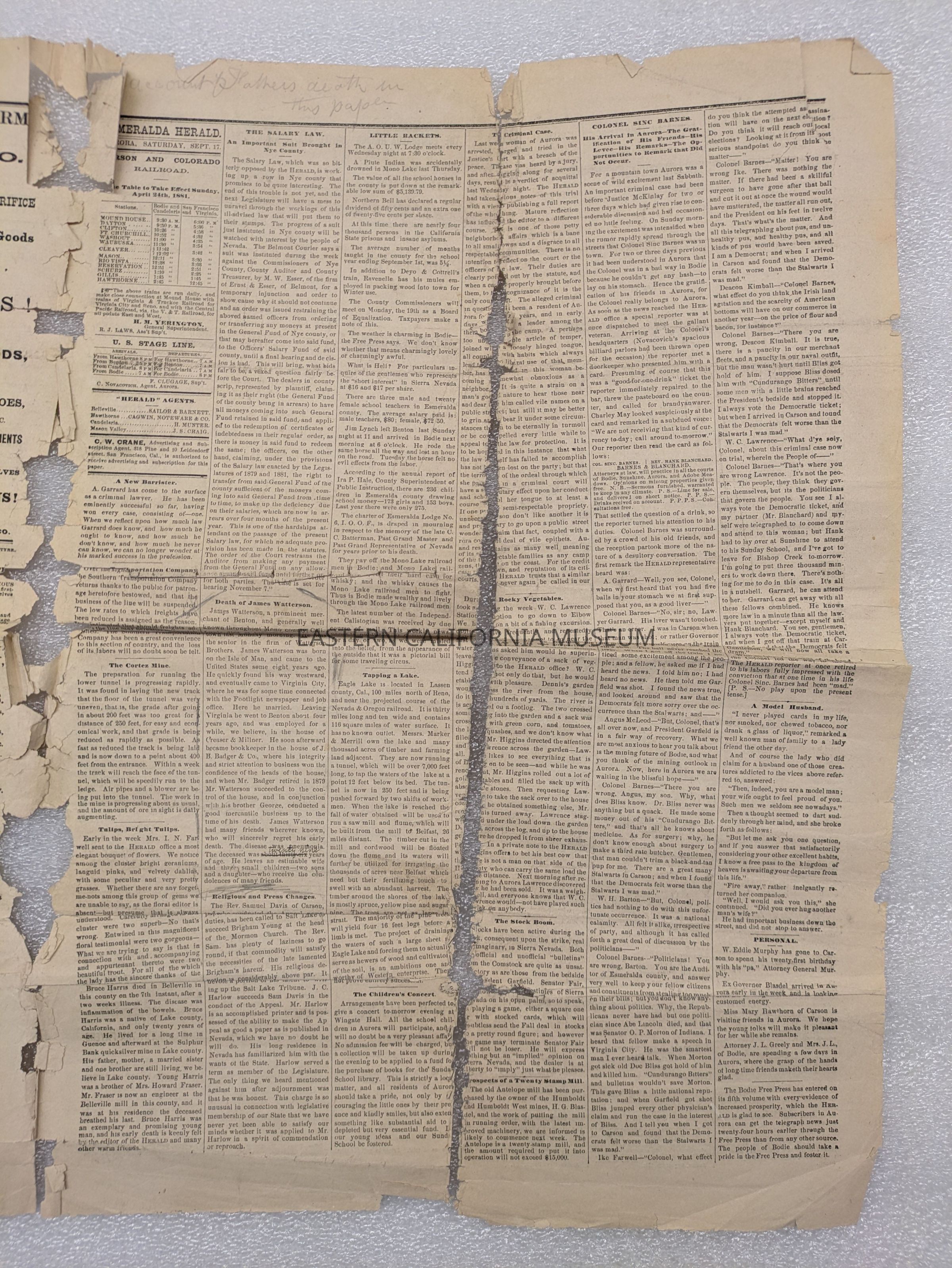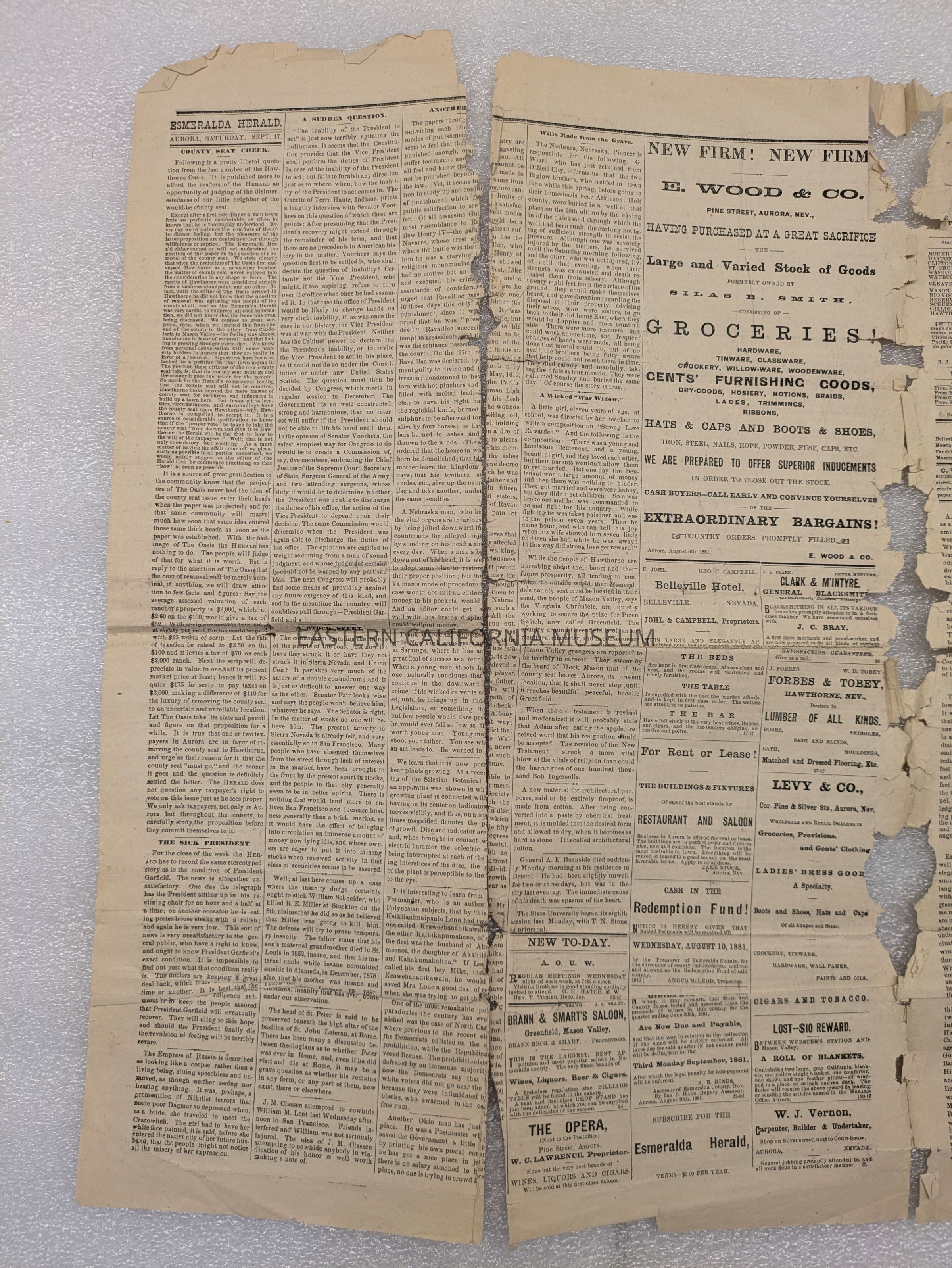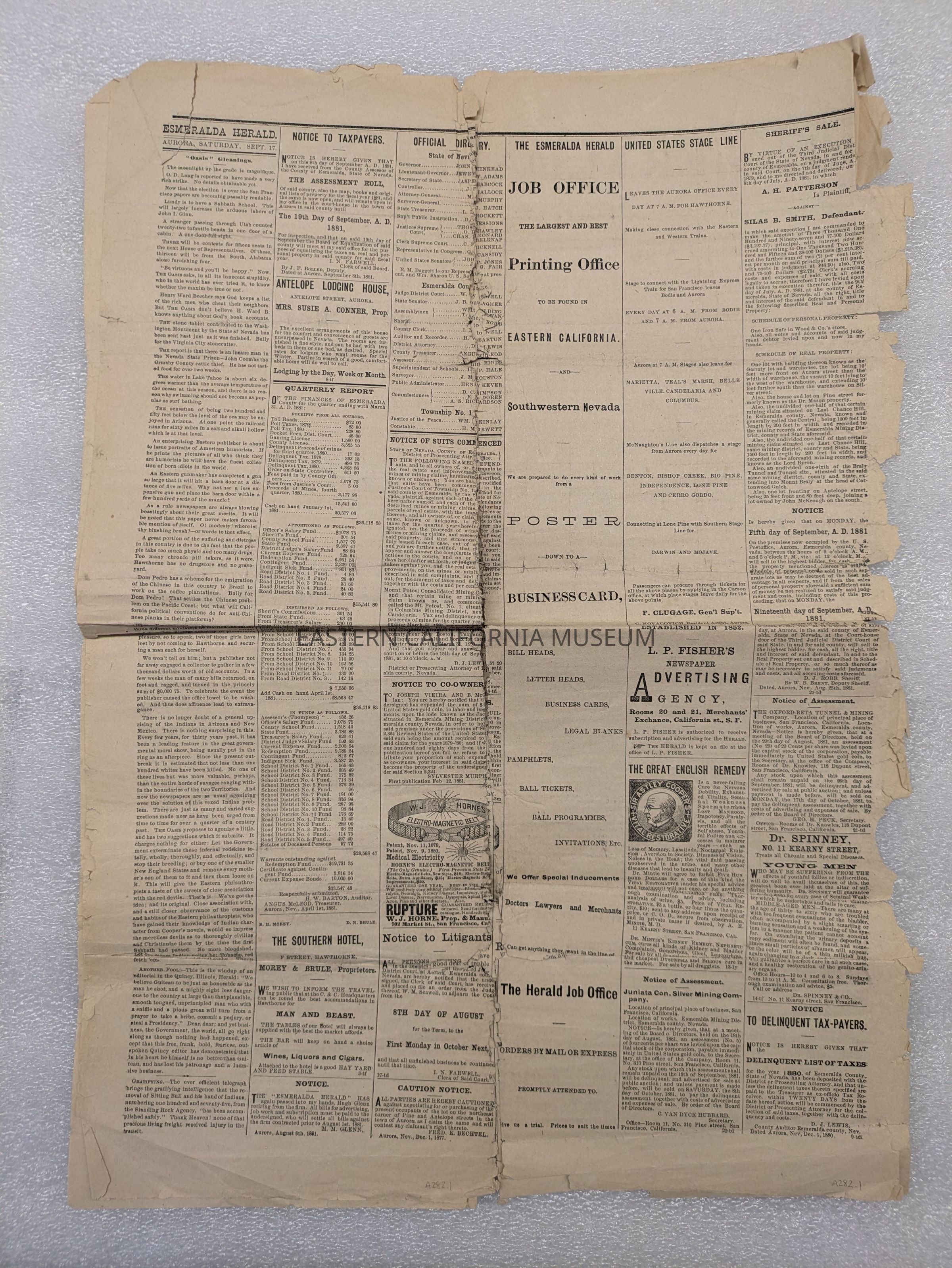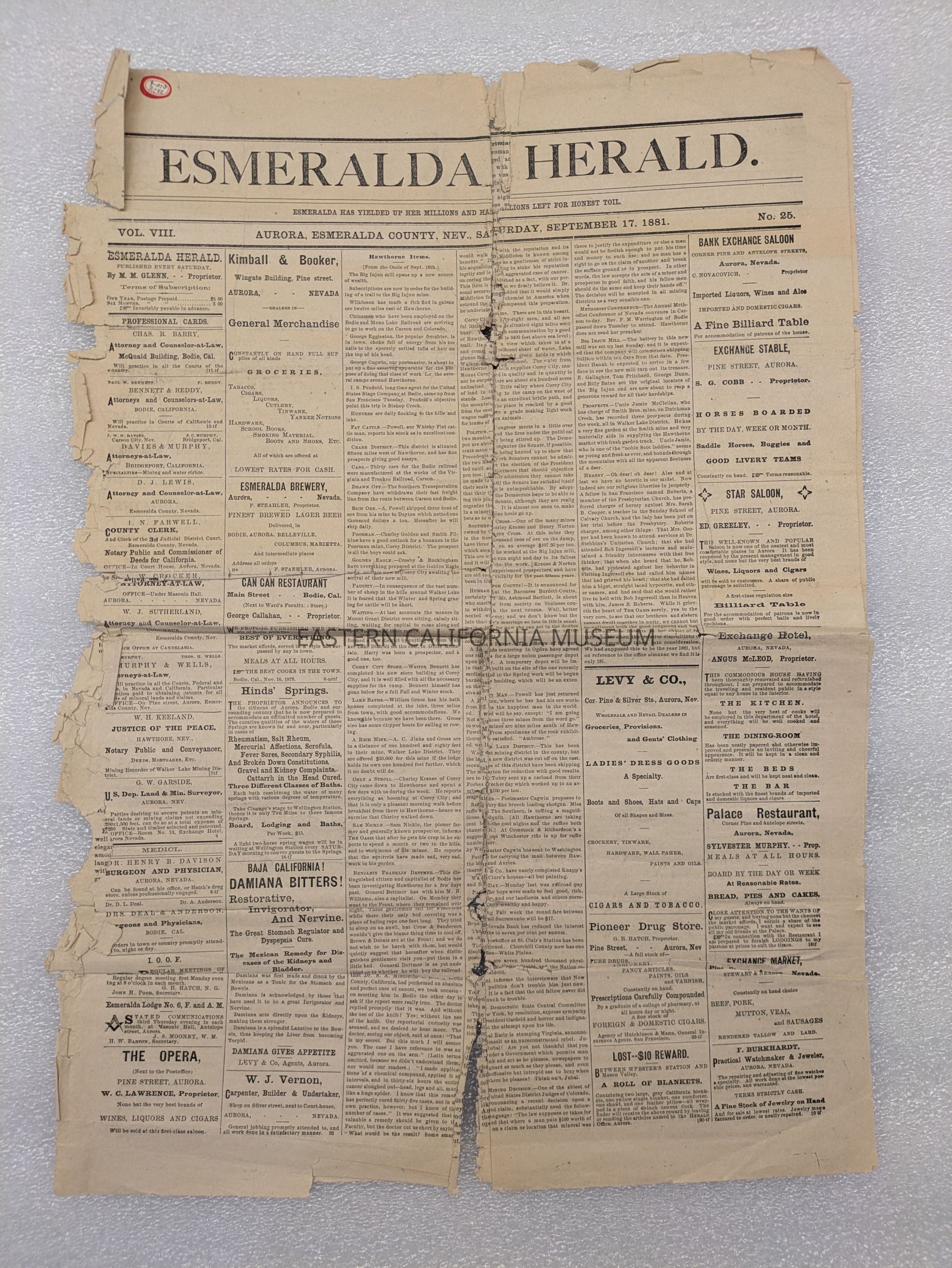 Newspaper: Esmeralda Herald, Vol. VIII, No. 25, September 17, 1881. Printed in Aurora, Esmeralda County, Nevada.