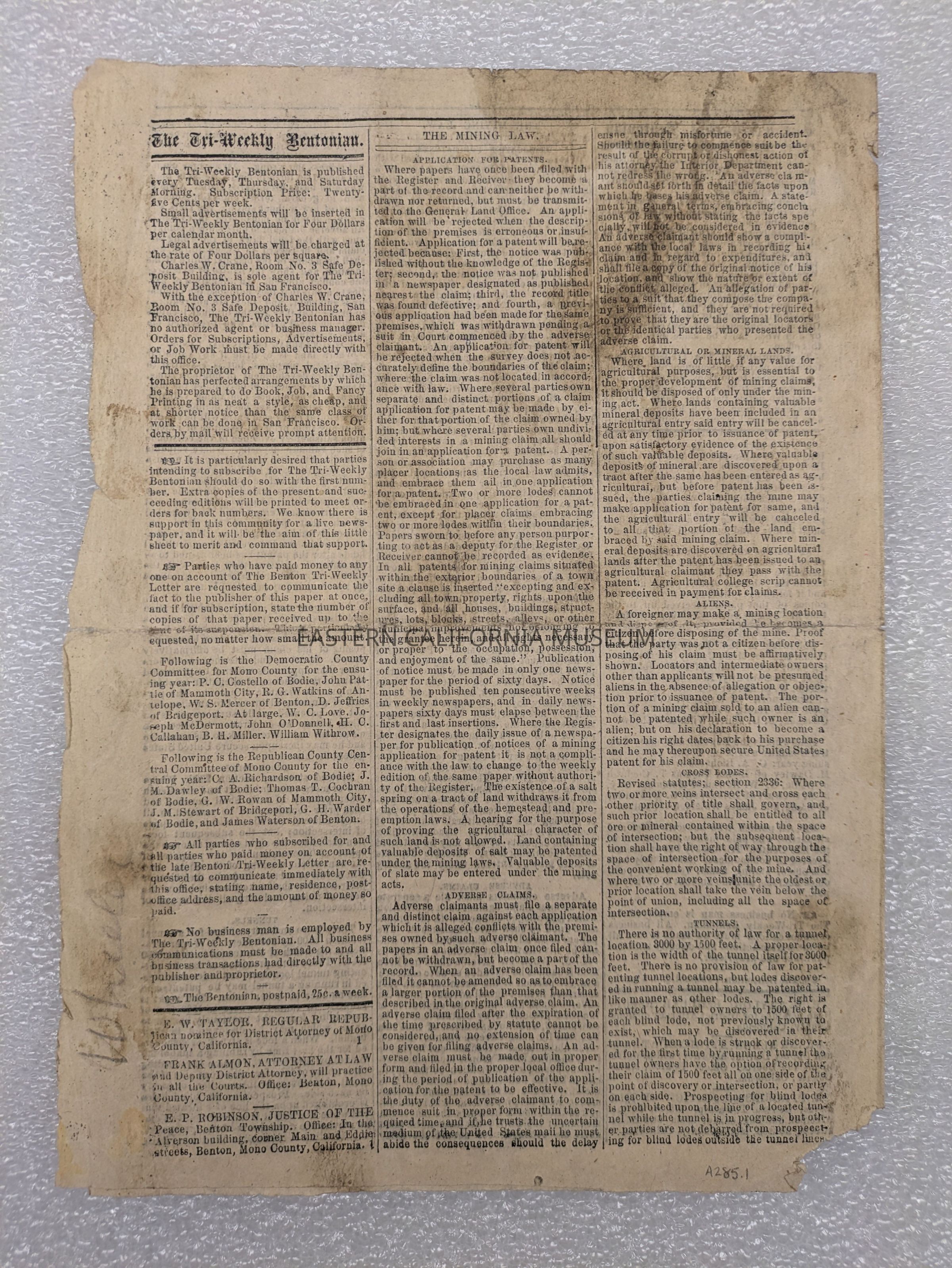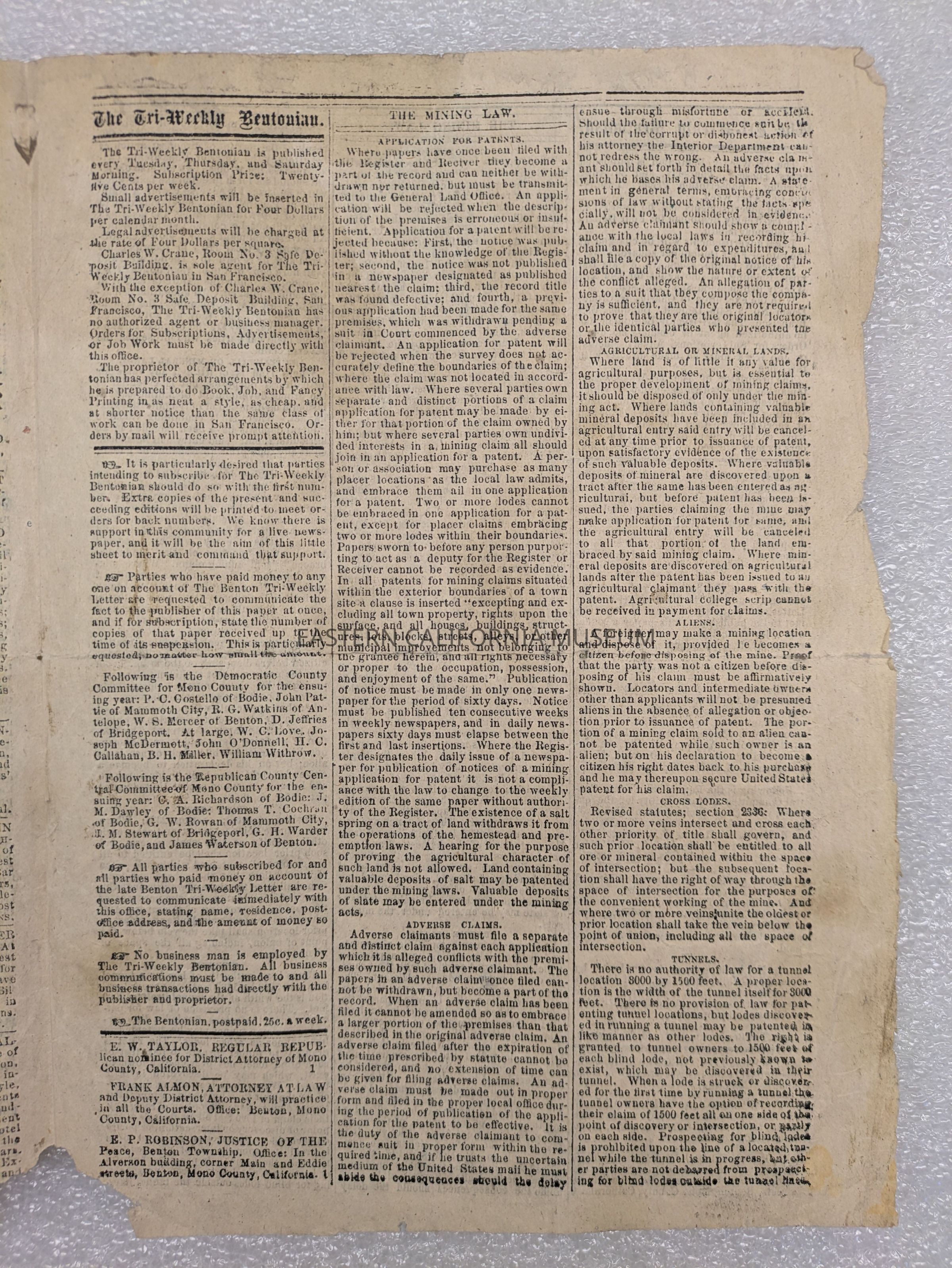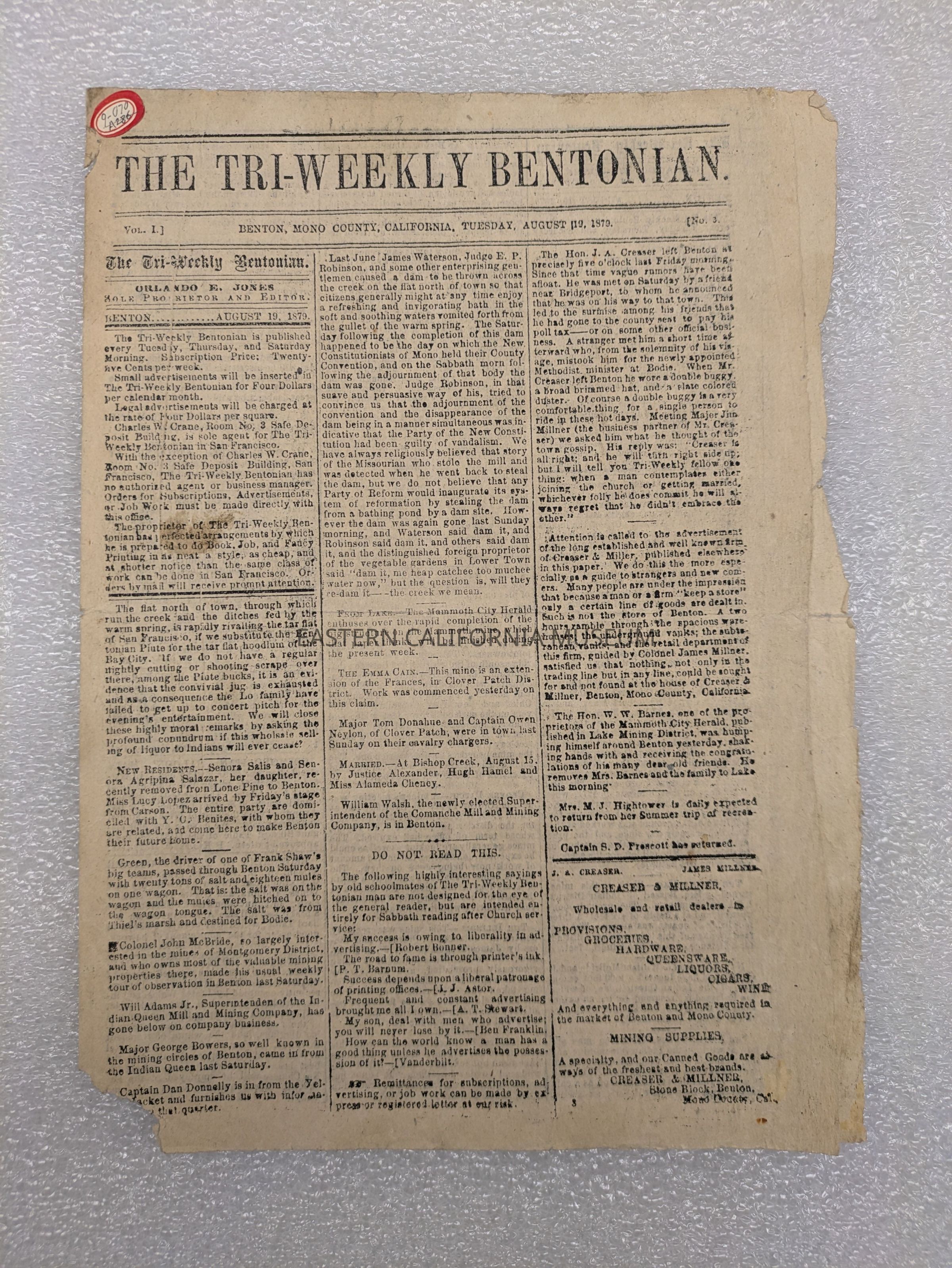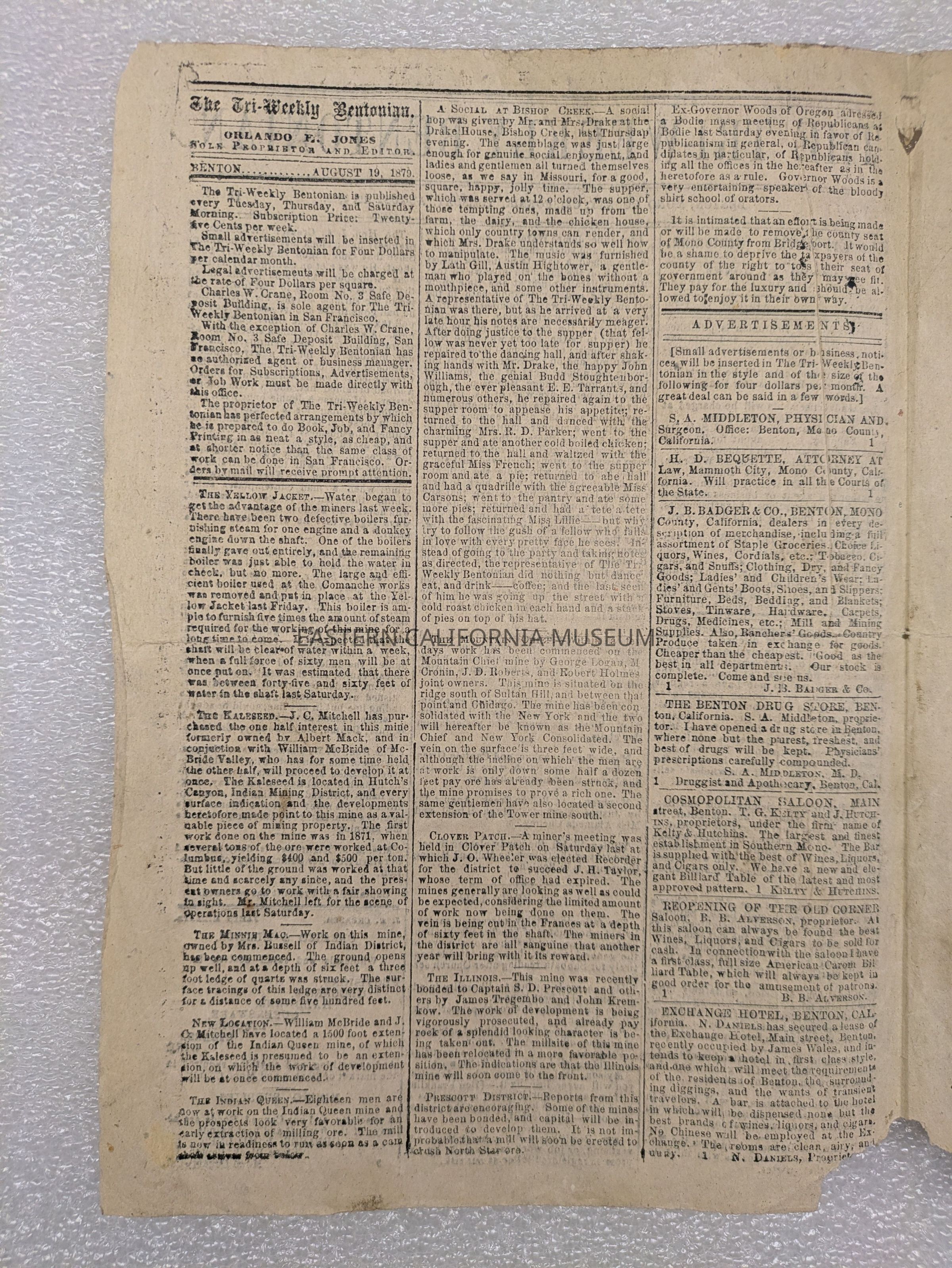 Newspaper: The Tri-Weekly Bentonian, Vol. 1, No. 3, August 19, 1879.Collection
