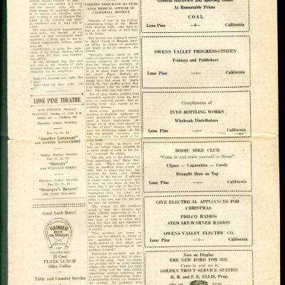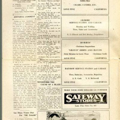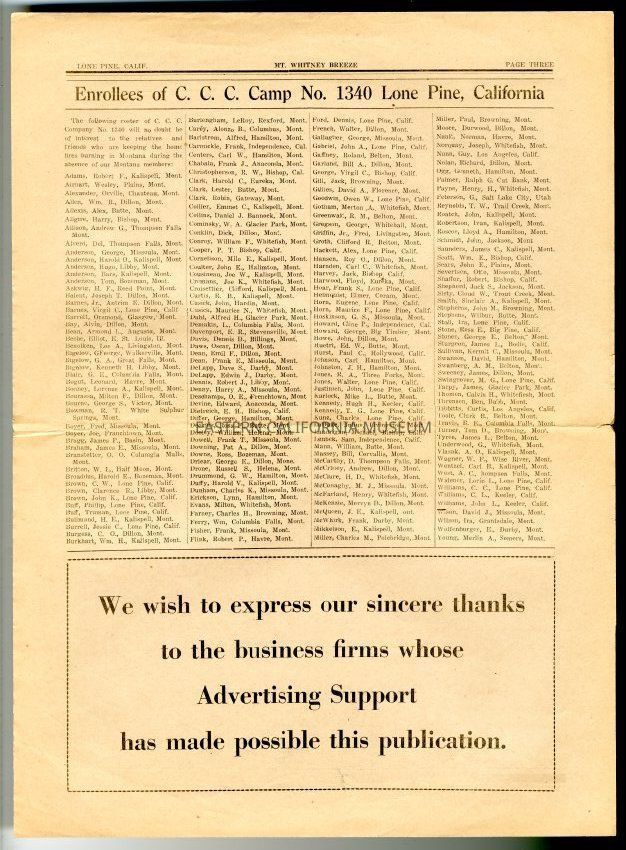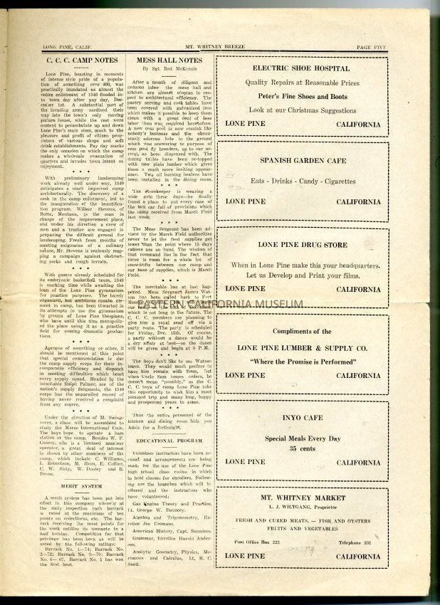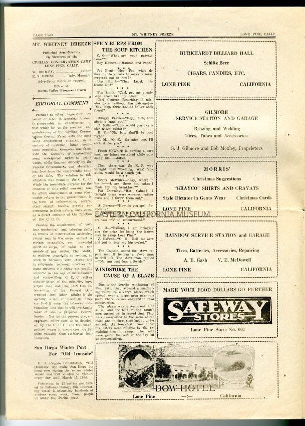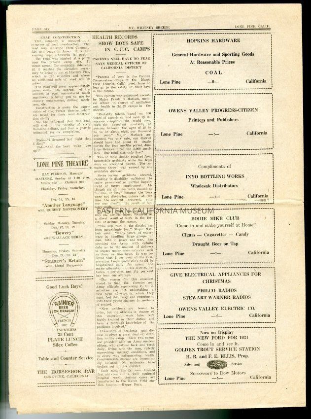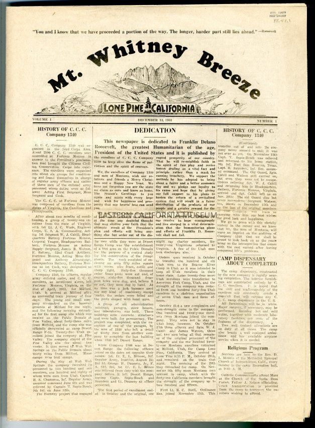 Mt. Whitney Breeze, Vol. 1, No. 1, December 13, 1933. Published in Lone Pine by the enrollees of the C.C.C. [Civilian Conservation Corps] Company #1340. It previously belonged to the Inyo County Free Library.Collection