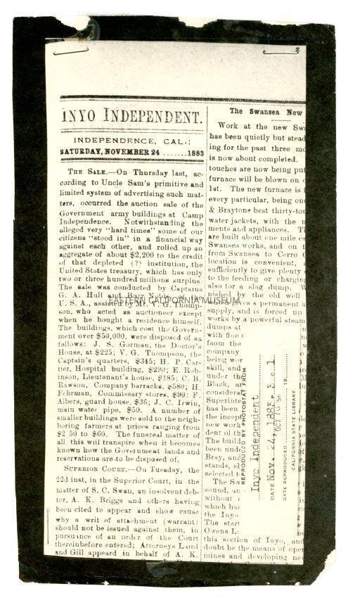 Photocopy of part of a column from the Inyo Independent for Saturday, November 24, 1883. Notice of sale of buildings at Camp Independence.