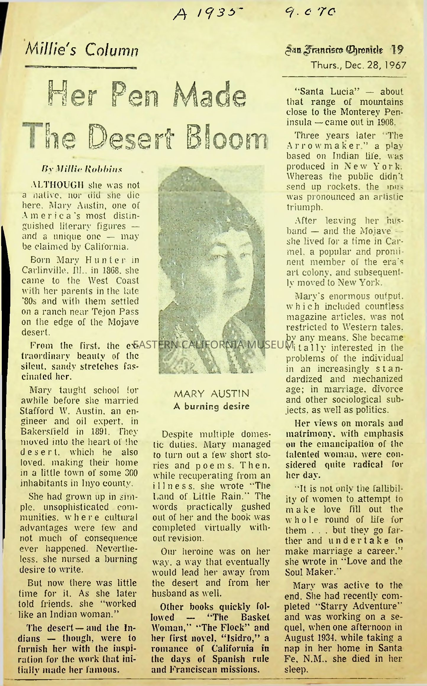 Newspaper clipping from the San Francisco Chronicle dated December 28, 1967 titled "Her Pen Made the Desert Bloom" by Millie Robbins. The subject of the article is Mary Austin.Made/Created