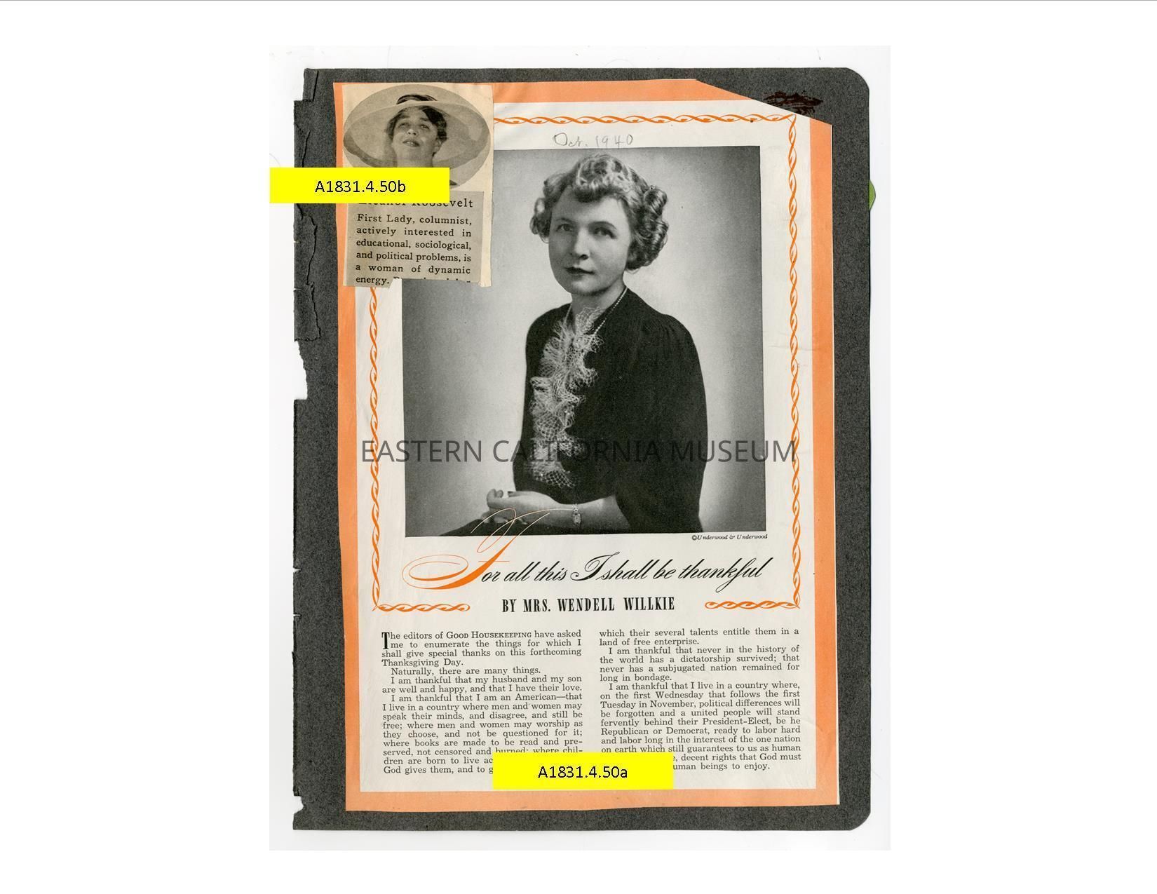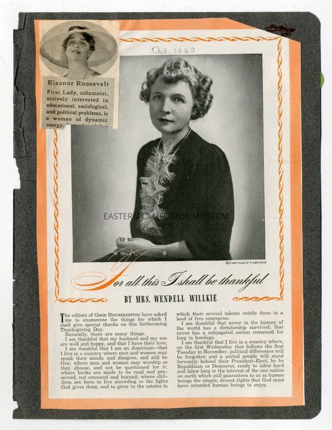 A1831.4.50a: Magazine clipping titled, "For all this I shall be thankful" by Mrs. Wendell Willkie. It is dated October 1940 and has to do with things to be thankful for on the upcoming Thanksgiving Day.