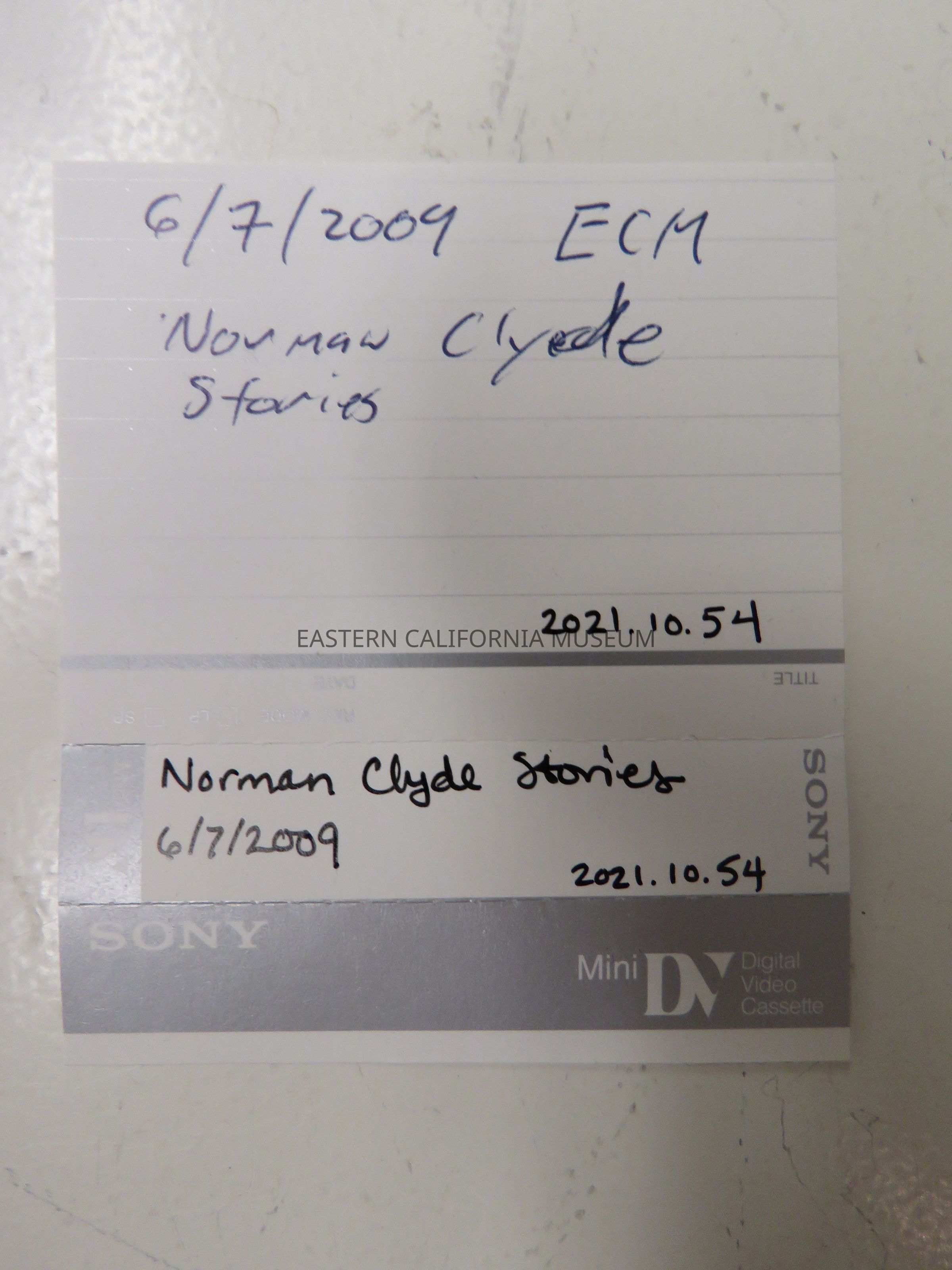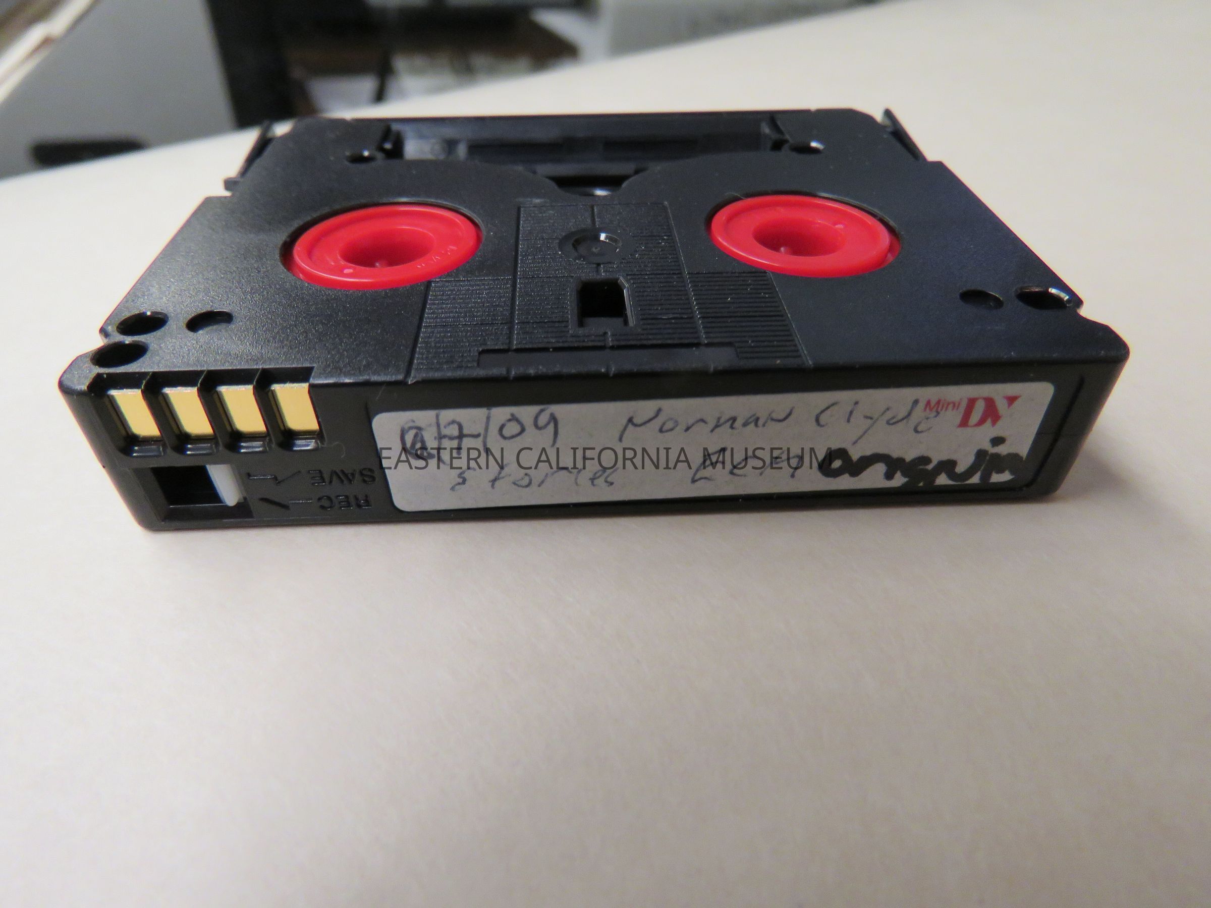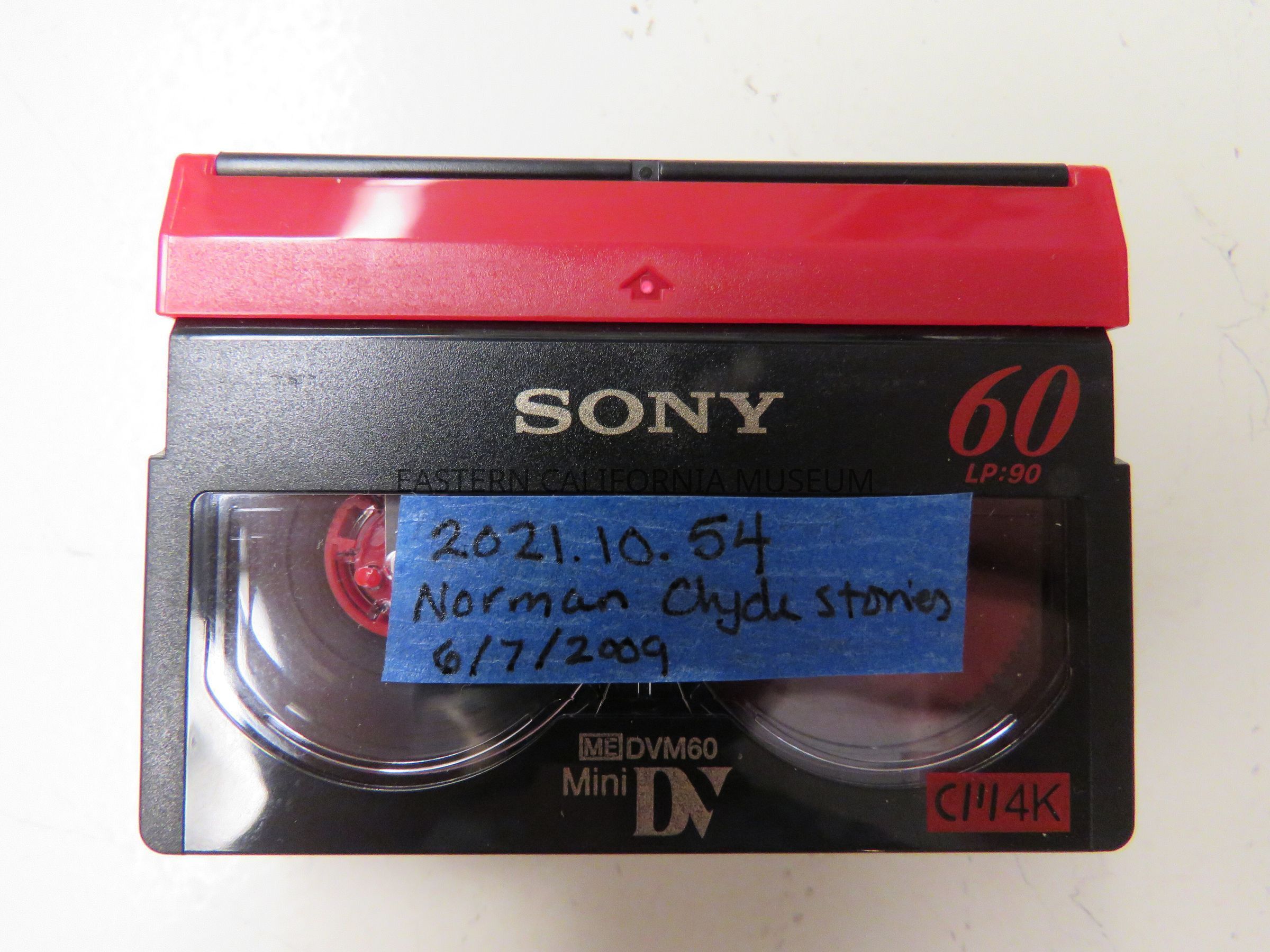Video cassette tape (Sony MiniDV) titled, "Norman Clyde Stories" and dated 06/07/2009.