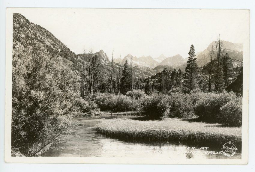 Black and white photo postcard of a river, meadow, and mountains titled, "North Fork, Bishop Creek at Lake Sabrina Camp, Bishop, California."